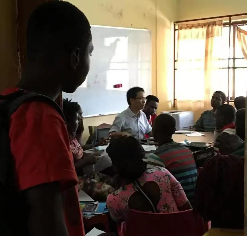 这幅作品中入镜的吴群彬老师曾于2009-2018年三次赴阿齐克韦大学孔子学院任教。彼时尼日利亚的工作与生活条件与国内相比差距大,周边社会治安很差,时有绑架事件发生。由于当地电力供应不足,断电是家常便饭,吴群彬在任时曾有七个月没有供电,晚上只能秉烛生活工作,还时常喝从屋檐接下来的雨水。由于安全问题,行动不自由与生活单调枯燥,吴群彬的日常基本是两点一线(宿舍——教室),可谓过着一种“半囚禁式”的生活,但他在那里默默坚守,教书育人、苦中作乐。他始终不忘初心,坚守在孔院教学的第一线,2014年曾被国家汉办授予“最美志愿者”的荣誉称号。