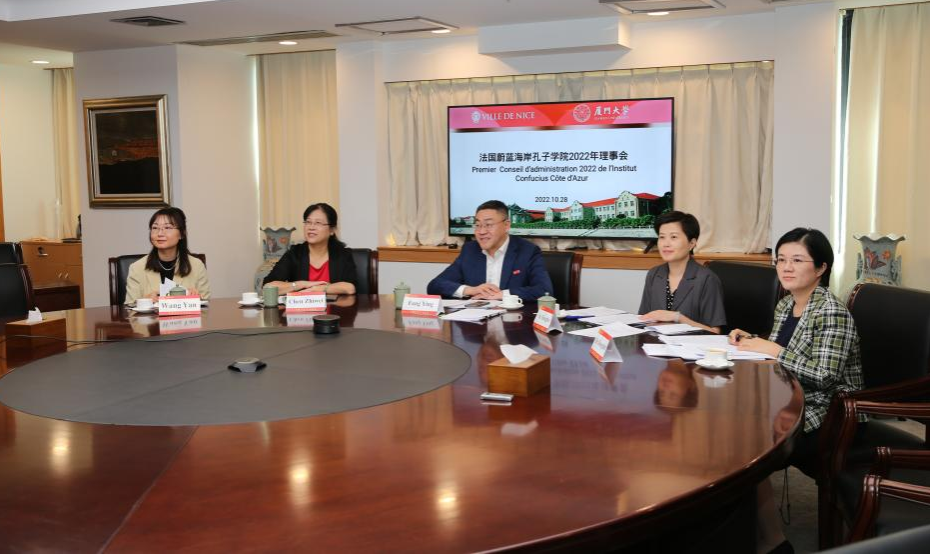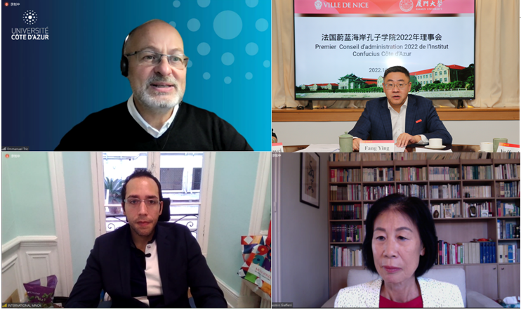 北京时间2022年10月28日下午,我校共建法国蔚蓝海岸孔子学院举行2022年视频理事会。蔚蓝海岸大学第一副校长、孔院前任理事长埃马纽埃尔·特里克(Emmanuel TRIC),我校校长助理方颖出席并致辞。尼斯市政府国际关系局亚洲事务处处长张明(Cyril Doutre),蔚蓝海岸大学中文系前系主任、孔子学院法方创始院长黄晓敏(Xiaomin GIAFFERRI),我校国际中文教育学院院长陈志伟,海外办学办执行主任、国际处副处长余宏波等理事会成员共同参会。一同参会的还有我校中外语言交流合作中心副主任何冬梅、孔子学院中方院长王彦等。