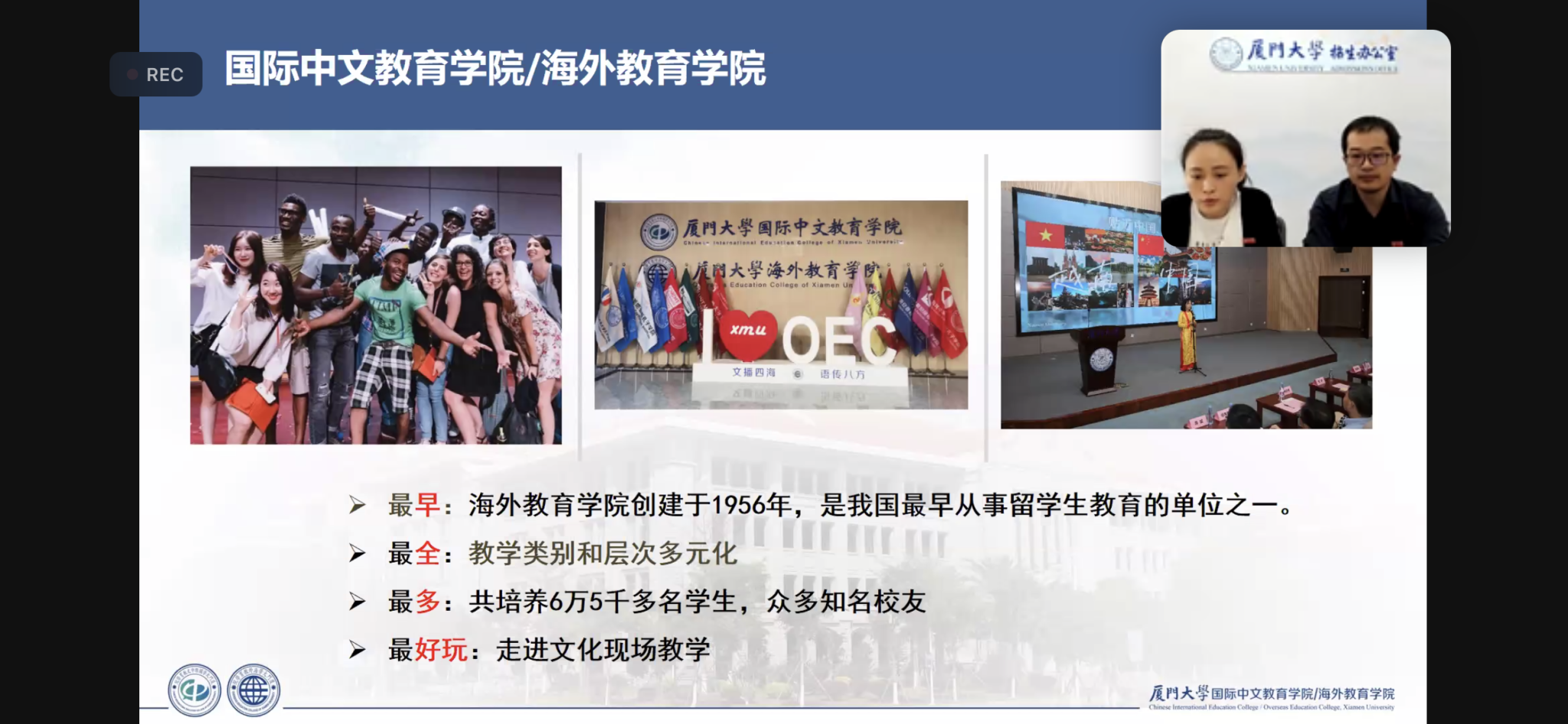 学校招生办公室胡雪磊老师介绍了学校的基本情况和入学申请程序,并结合国际中文教育学院/海外教育学院丰富的文化活动,全方位展示了留学生在厦门大学的学习和生活。