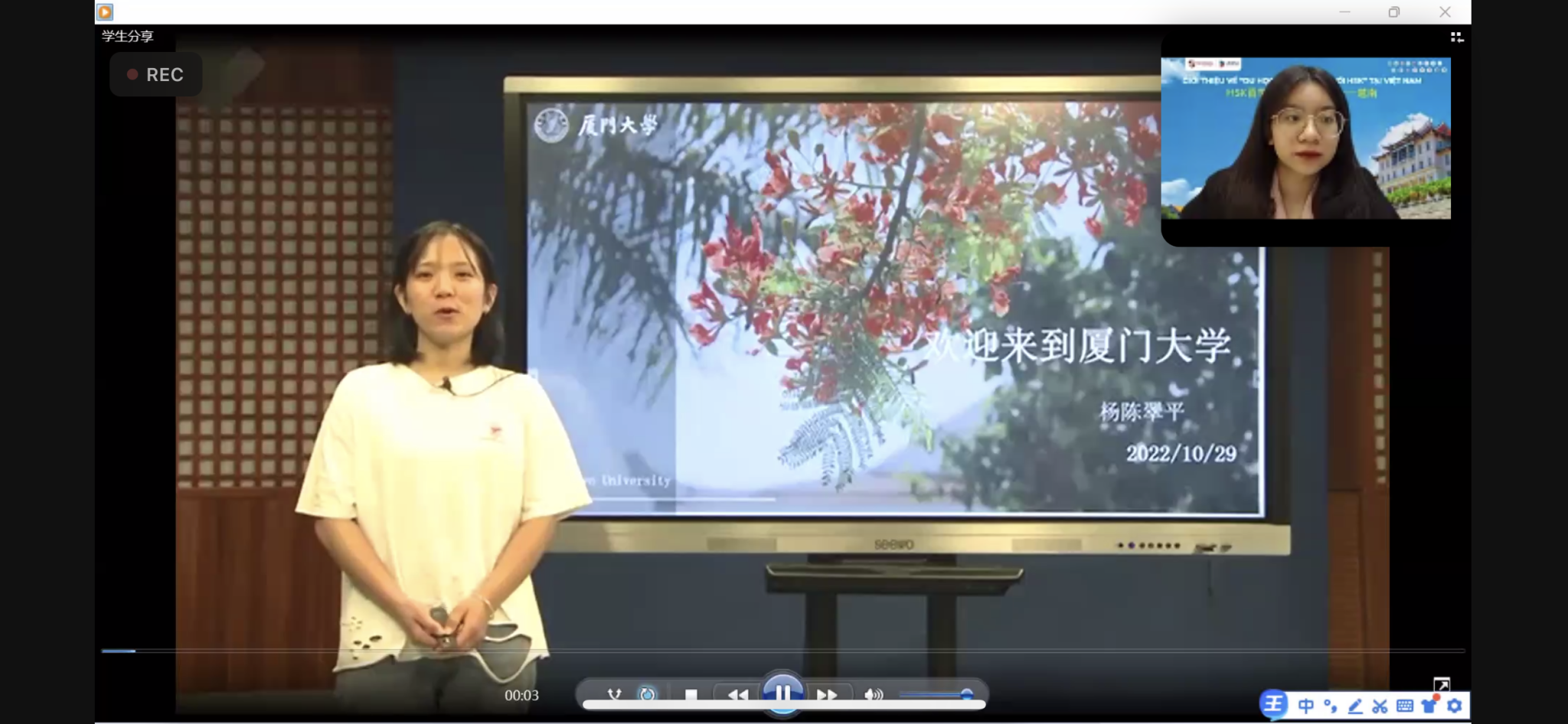宣讲会上,我院来自越南的硕士研究生杨陈翠平介绍了自己在厦门大学的学习生活,并分享了自己申请奖学金的经验。她针对越南留学生最关心的问题,介绍了自己在学校喜欢的美食、美景,还有同学们眼中的厦门大学。她特别分享了上周参加学院组织的“慧识中国”国际学生汉语应用大赛的经历,赛前老师耐心指导、同学热情协助,充分感受到学院的温暖,期待更多的越南同学来厦门大学。