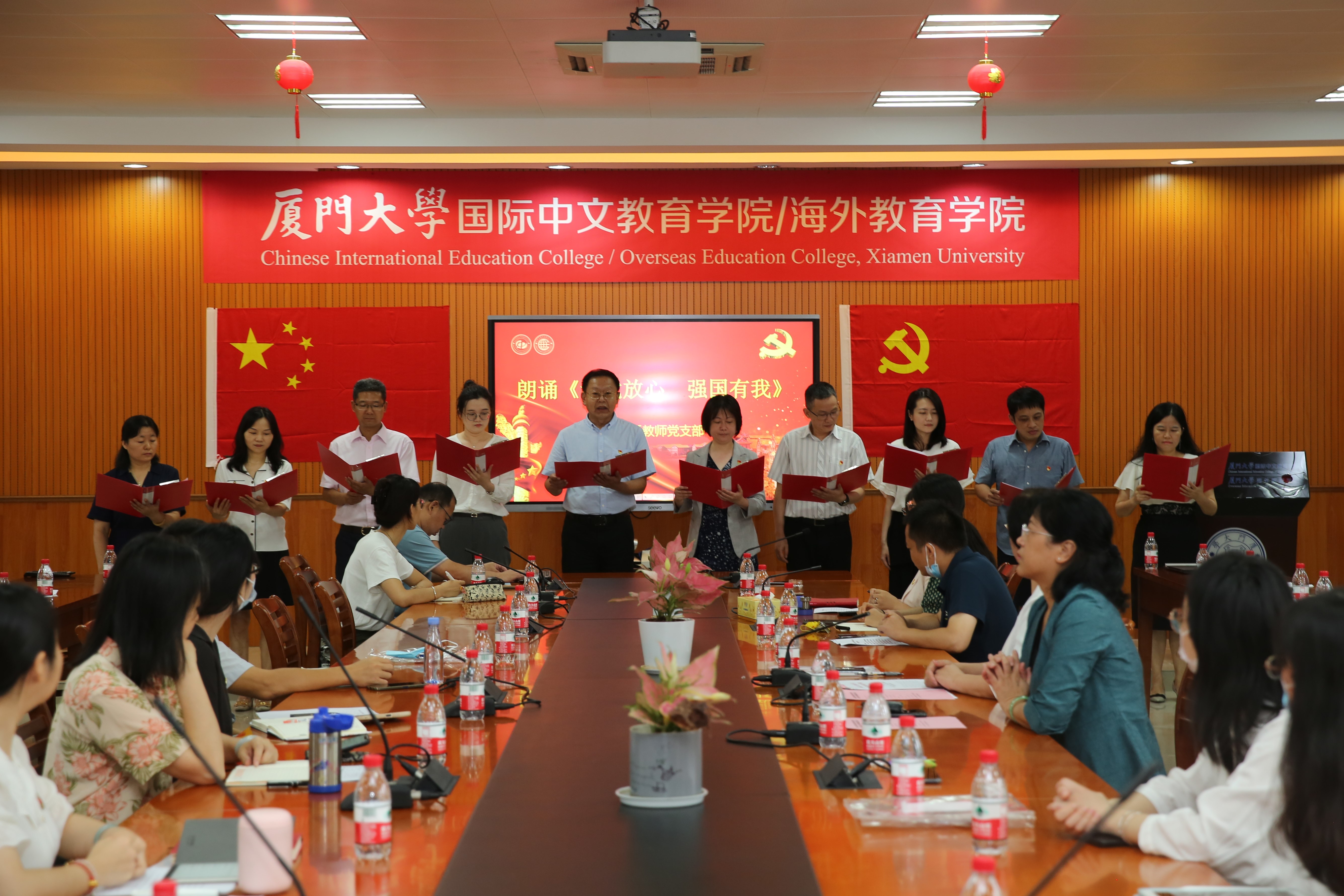 不忘初心拥护党,踔厉奋发为中华。在奏唱中华人民共和国国歌后,华文系教师党支部朗诵了朱水涌老师撰写的《请党放心 强国有我》(厦大版),党员同志们深情诉说,字字珠玑、声声铿锵,回顾了枪林弹雨峥嵘往昔、爱国奋进南方之强;展望着时代强音大国担当、积极勇为厦大篇章。郑重承诺请党放心、强国有我!