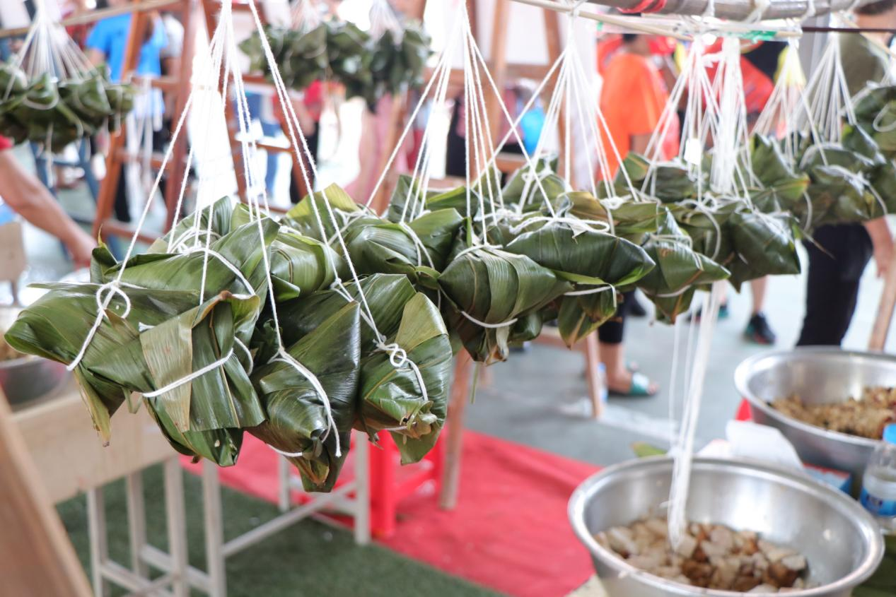 当天上午,伴着金锣的一声脆鸣,一场紧张激烈的“包粽子”大赛拉开了帷幕,社区的阿姨们分成几只队伍,她们将粽叶埋在掌心,麻利地往里填充馅料,随后再将五六颗饱满的粽子捆成一簇挂在竹竿上,晶莹的油花点缀在粽叶上,让人垂涎欲滴。