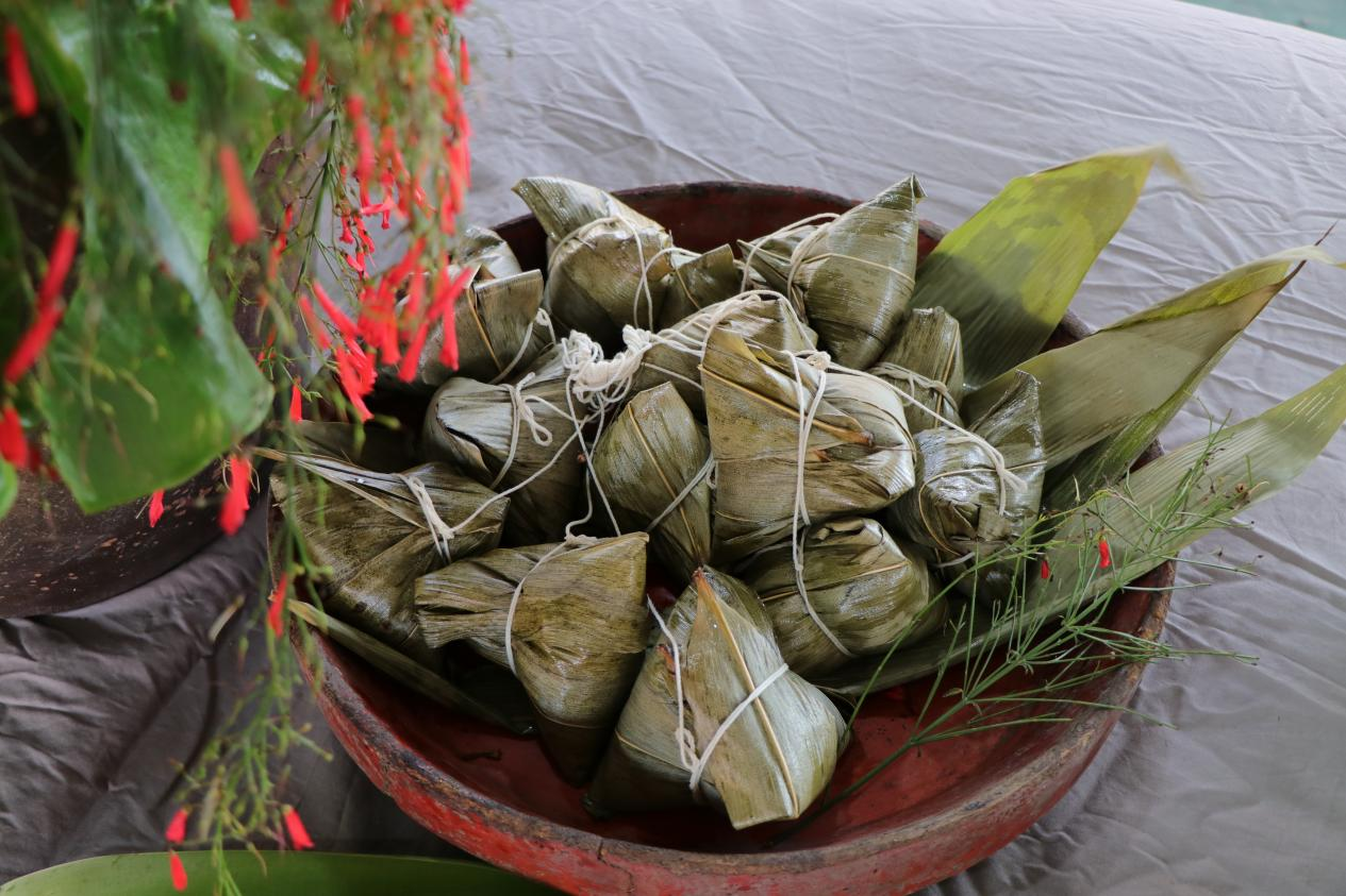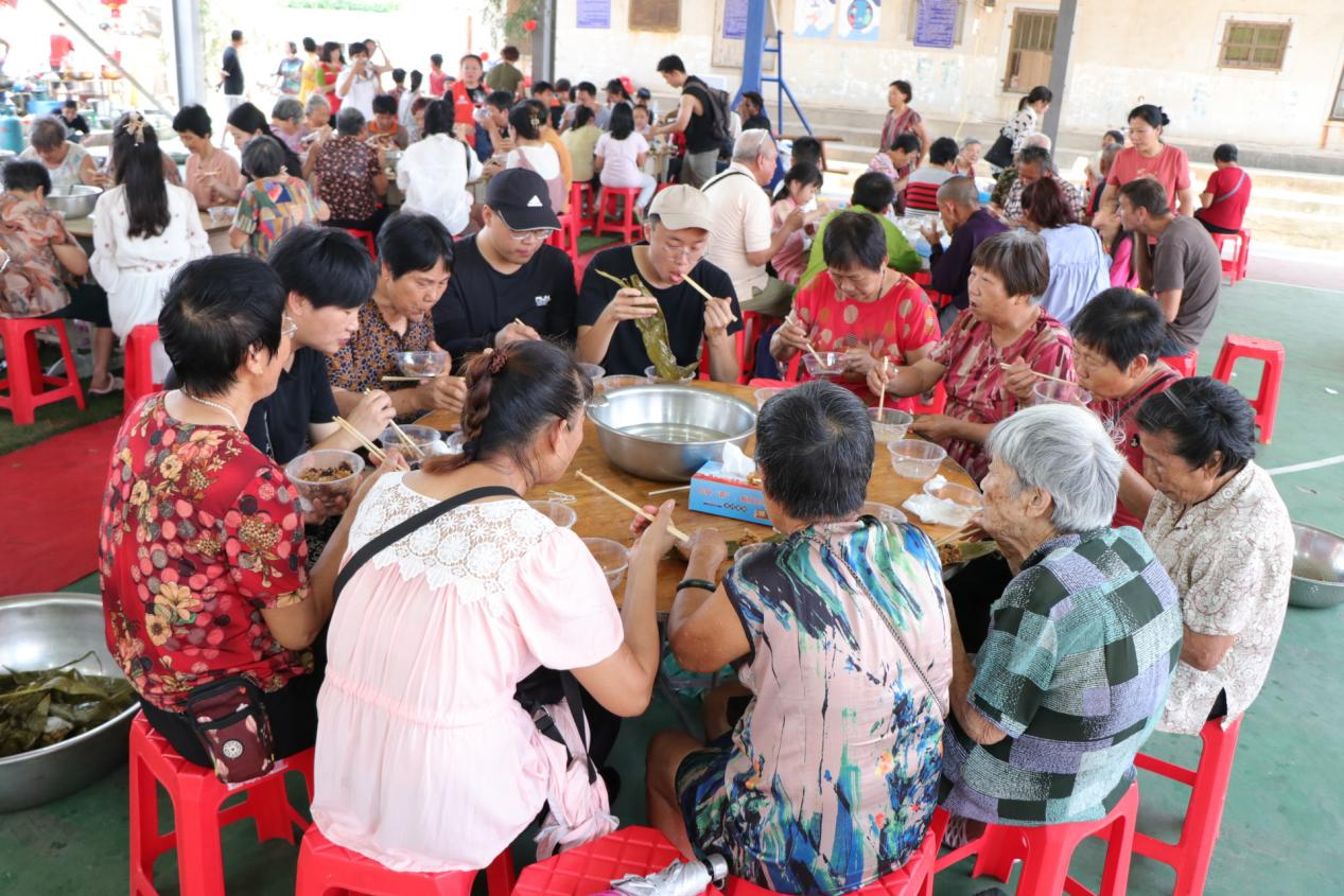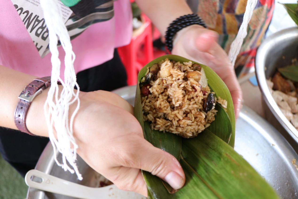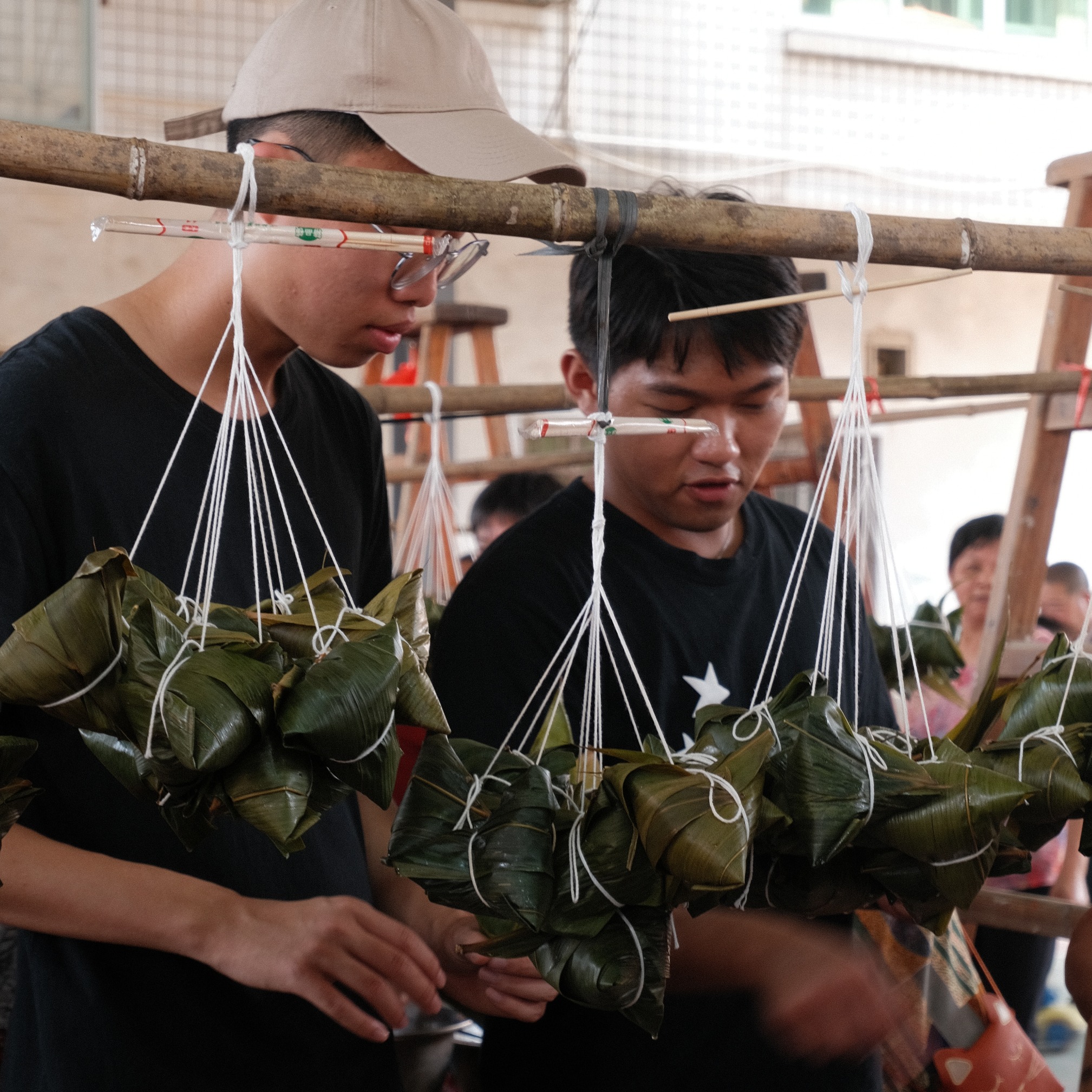 未及晌午,厨师敞开锅盖,引来滚滚白烟,第一批粽子新鲜出炉,肉粽的清香与人群的热情氤氲交织。众人剥开油滑的粽叶,往肉粽一角大口咬去,咸糯的米粒裹满了肉汁,海蛎的鲜甜也随即迸发而出,这世上的珍馐也不过如此!茶余饭后,大家围坐在老人身侧,聆听着古厝中发生的故事,国际学生们更和孩子们打成一片,端午的气氛在此刻臻于佳境。