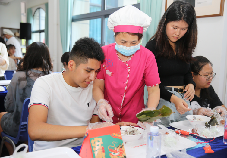 国际中文教育学院/海外教育学院徐艳艳老师图文并茂地为大家介绍包粽子等端午节俗,引起一众师生的浓厚兴趣,大家都迫不及待地想参与其中。粽子作为端午节必不可少的美食,其制作历史悠久,口味多样。包粽子可是一门学问,从食材的挑选,粽叶的拿捏,到粽绳的缠绕,以及如何让它在入水之后不“露馅”,这都是需要专业人员进行指导的。厦门大学后勤集团食堂工作人员一边为大家讲解包粽子的步骤一边示范做法,然而“师傅领进门,修行在个人”,起初大家包粽子的手法还不太熟练,有的漏米有的系不上绳,经过工作人员的细心指导,大家逐渐掌握了包粽子的方法,不一会儿,漂亮的粽子就成型了。这些粽子不仅是一种美味的食物,更是文化传承与延续的缩影。