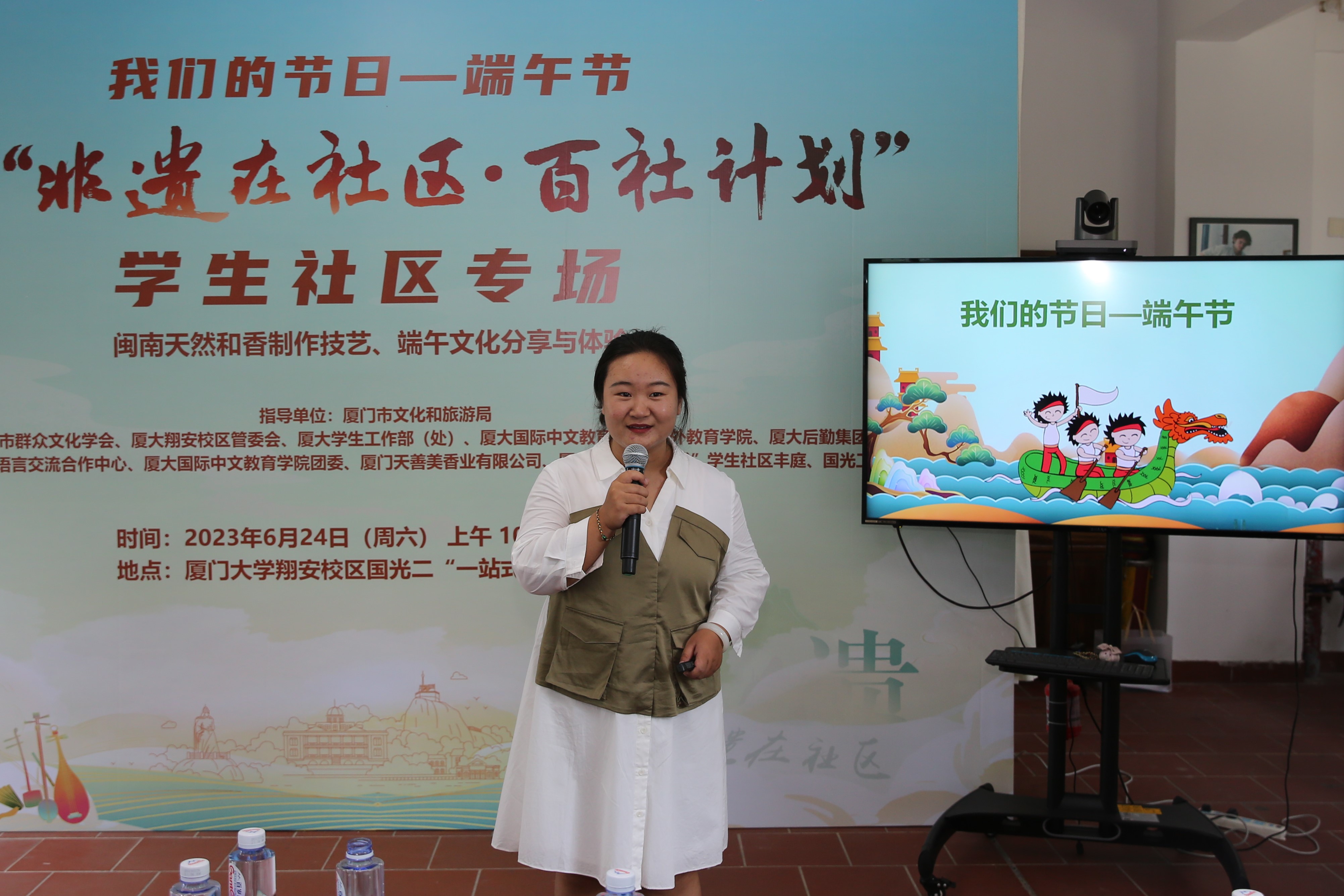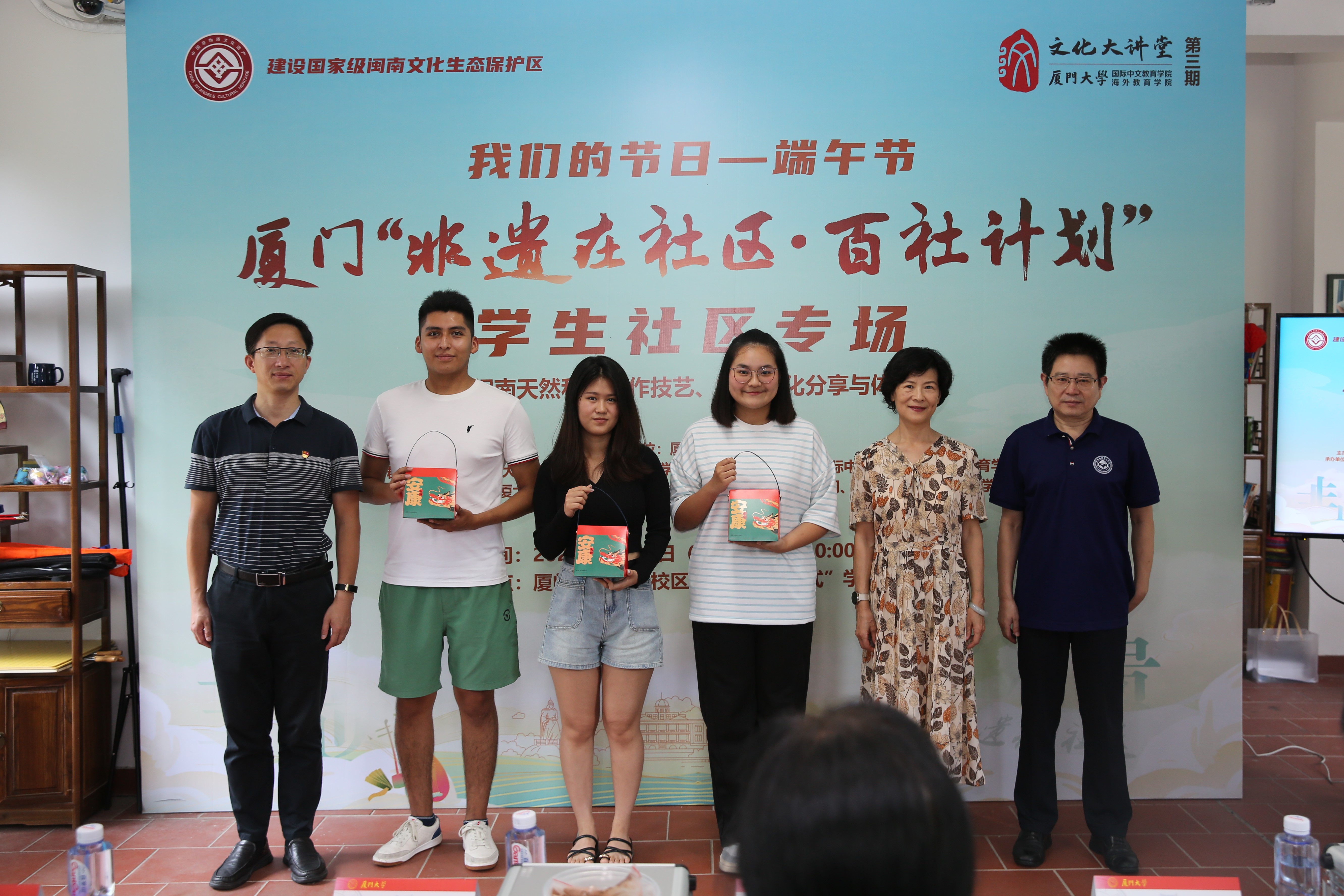 本次“文化大讲堂”由厦门市群众文化学会、厦门大学翔安校区管委会、厦门大学学生工作部(处)、厦门大学国际中文教育学院/海外教育学院、厦门大学后勤集团主办,厦大中外语言交流合作中心、国际中文教育学院团委、厦门天善美香业有限公司、厦门大学翔安“一站式”学生社区丰庭、国光工作组协办。活动将端午文化与非遗相结合,立足学生社区,推出端午非遗系列活动,不仅增添传统节日的浓厚氛围,还让中外师生了解和体验到厦门非遗文化,对非遗文化起到了很好的宣传作用。未来,厦门大学国际中文教育学院/海外教育学院将依托“文化大讲堂”这一品牌,整合各方资源,持续开展传统节俗及非遗活动,让更多的人在节日中回归传统,让非遗等传统文化在现代生活中得以更新、在年轻学子身上得以延续。