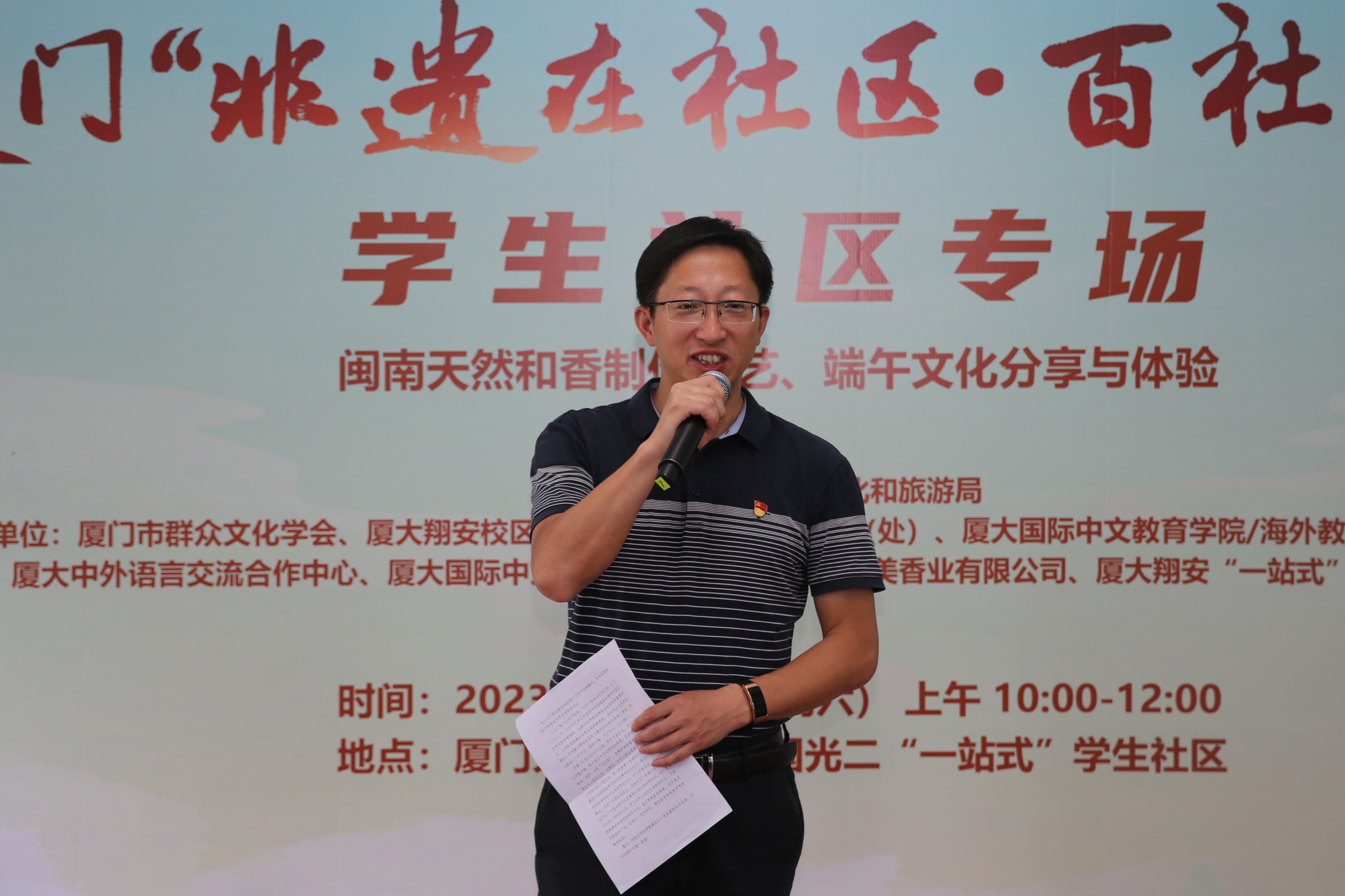 为增强文化自觉,坚定文化自信,大力传承发展中华优秀传统文化,进一步提高对非物质文化遗产的保护意识,营造“非遗”传承的良好氛围,6月24日端午佳节期间,厦门大学文化大讲堂第三期——厦门“非遗在社区·百社计划”学生专场活动在厦门大学(翔安校区)国光二“一站式”学生社区顺利举行。厦门市文旅局党组成员、副局长魏峰、厦门文旅局公服处(非遗处)副处长苏华琦、厦门大学关工委副主任郑冰冰、厦门大学学生工作部副部(处)长高斌,厦门大学国际中文教育学院/海外教育学院院长陈志伟、厦门大学后勤集团党委书记杨云良、厦门市天善美香业有限公司总经理、非遗传承人梁科文及来自中国、日本、泰国、印度尼西亚、老挝、菲律宾、德国、印度、加拿大、塔吉克斯坦、玻利维亚、柬埔寨等12个国家热爱非遗文化的中外师生共计70余人参加了活动。活动由国际中文教育学院/海外教育学院学生孙昊泽和马璇一同主持。