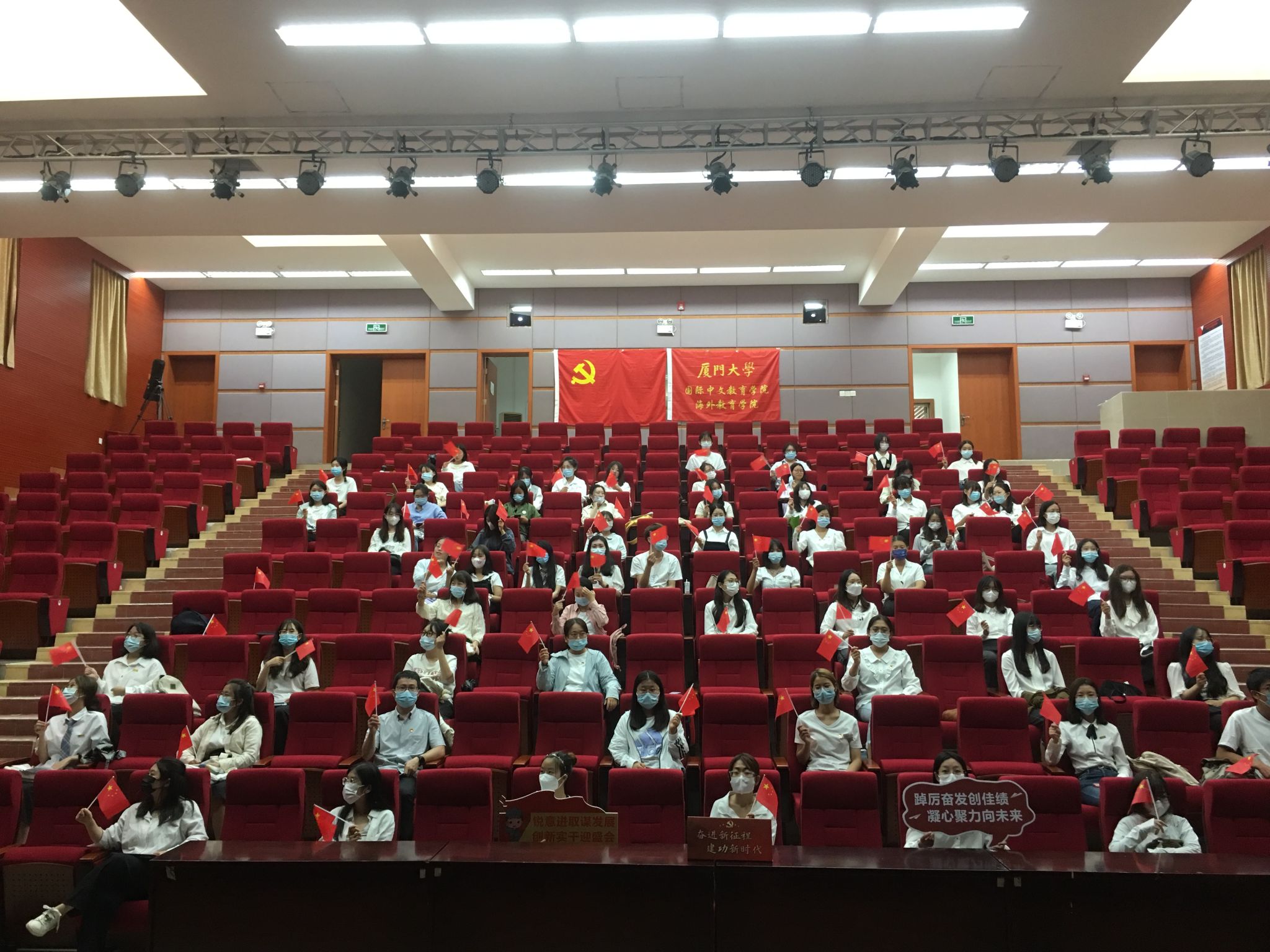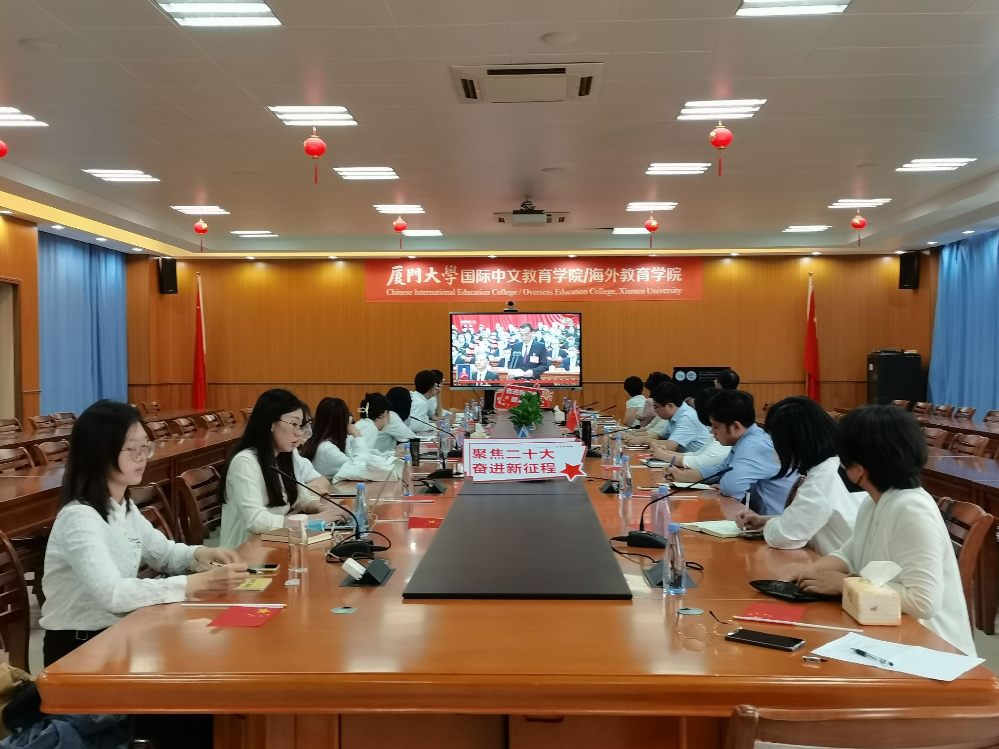 10月16日上午,中国共产党第二十次全国代表大会在北京人民大会堂隆重开幕。国际中文教育学院/海外教育学院党委组织师生集中收看党的二十大开幕实况,聆听习近平总书记报告。学院党委委员、师生代表于翔安校区坤銮楼C104观看直播并开展座谈。其他在校学生于C102报告厅集中收看。学院多个会场内举目可及红色宣传牌,师生党员人手一面国旗,气氛热烈。