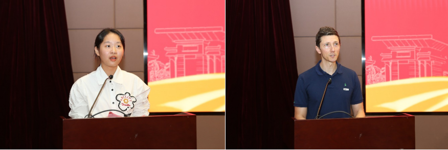 国内研究生代表陈玮与国际新生代表韩森山发言。陈玮描述着自己眼中美丽的厦大,期待在这里的学习与生活,成为未来知识的创造者、贡献者,为汉语教学事业和文化传播事业加一把柴,添一把火。韩森山讲述了自己选择在厦大学习汉语的原因,希望能与同学们共同进步、增进理解、建立友谊,深入了解中华文化,认识更加真实、全面的中国。