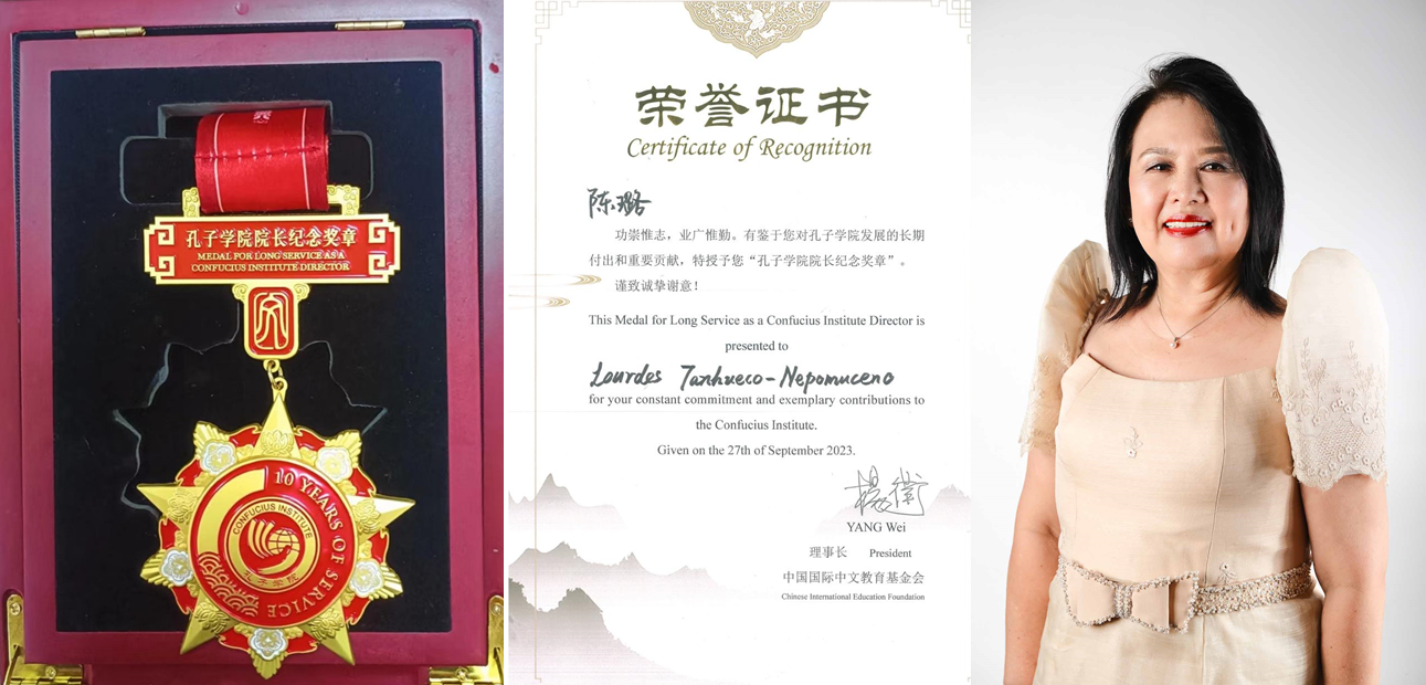 在孔子学院院长纪念奖章颁授仪式中,我校共建菲律宾大学孔子学院外方院长陈璐(Lourdes Tanhueco-Nepomuceno)荣获2023年“孔子学院院长纪念奖章”。该奖章是为在孔子学院任职满10年且深受中外好评的中外方院长而颁发的,以感谢中外方院长对孔子学院和国际中文教育事业的长期坚守和辛勤付出,肯定其对孔子学院建设和发展的积极贡献。