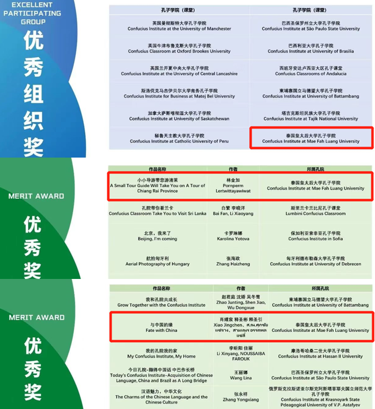 在“最·孔院”全球短视频征集活动颁奖仪式中,我校共建泰国皇太后大学孔子学院荣获第三届“最·孔院”全球短视频征集活动三个奖项,孔院选送的作品《与中国的缘》、《小小导游带您游清莱》两部作品荣获优秀奖,皇太后大学孔子学院荣获优秀组织奖。