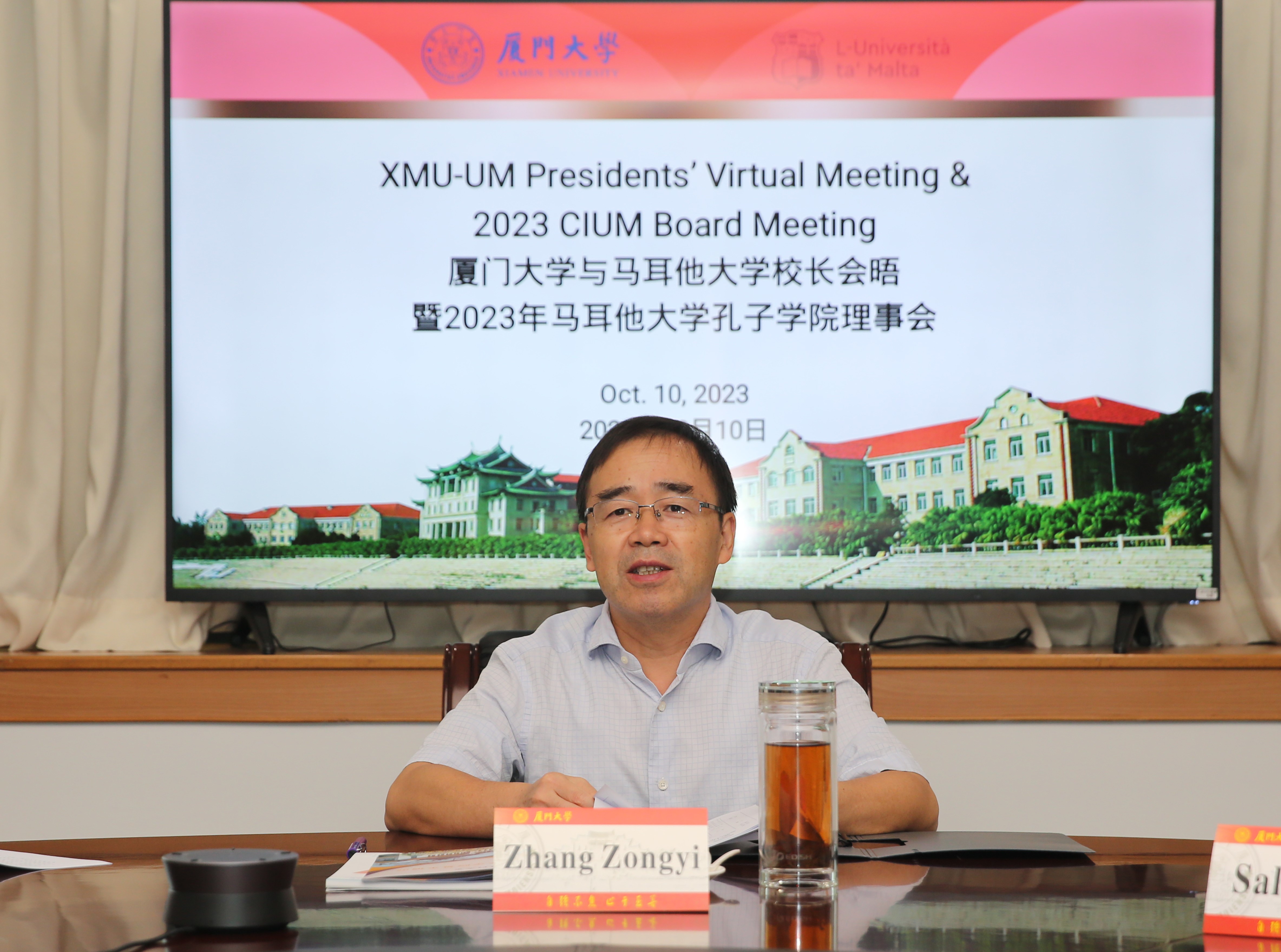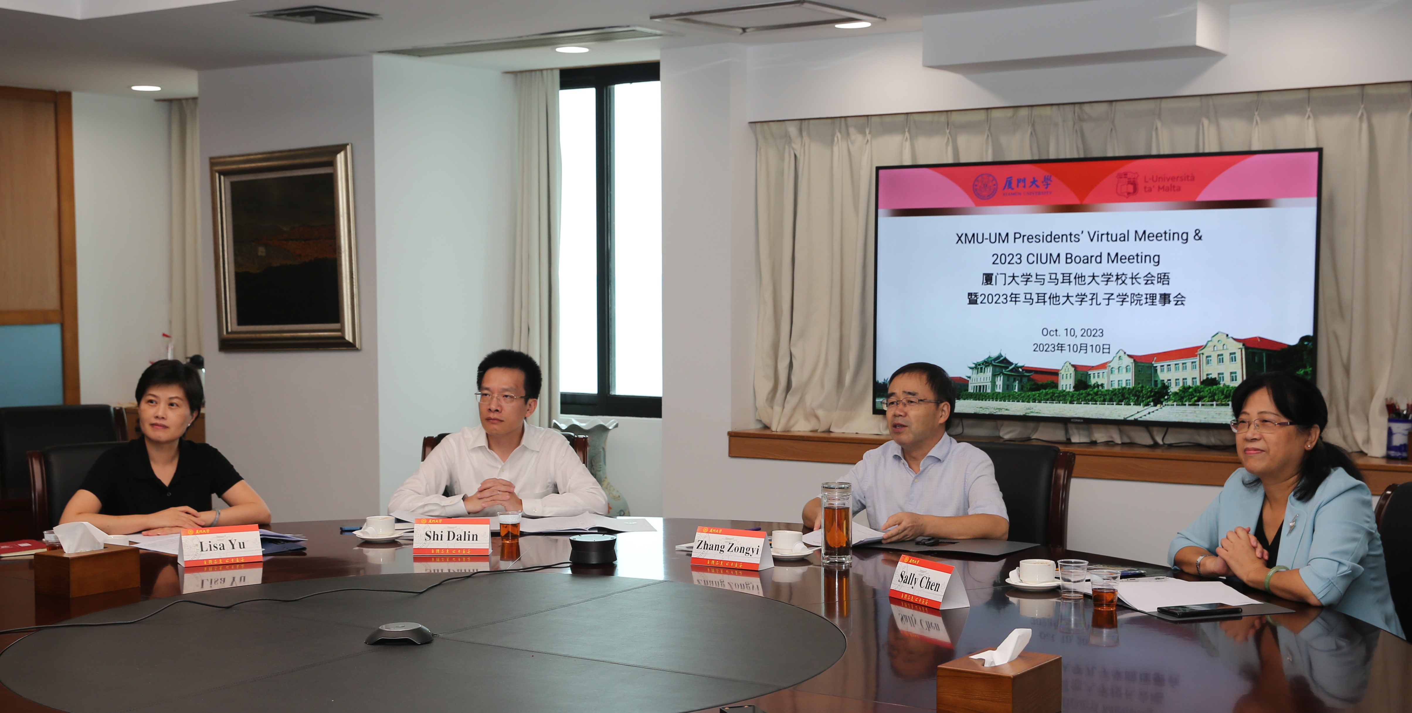 10月10日,厦门大学校长张宗益与马耳他大学校长阿尔弗雷德•维拉(Alfred Vella)进行视频会晤,厦门大学副校长史大林出席2023年马耳他大学孔子学院年度理事会。双方就如何深化两校合作及推动马耳他大学孔子学院发展深入交换意见。马耳他大学秘书长西蒙·萨马特(Simon Sammut)、国际处处长斯特凡尼娅·法布里(Stefania Agius Fabri),孔子学院外方院长丹尼斯·米齐(Dennis Mizzi)、中方院长聂爱霞,厦门大学海外办学办执行主任、国际合作与交流处副处长(主持工作)余宏波以及中外语言交流合作中心相关工作人员参会。会议由国际中文教育学院/海外教育学院院长陈志伟主持。