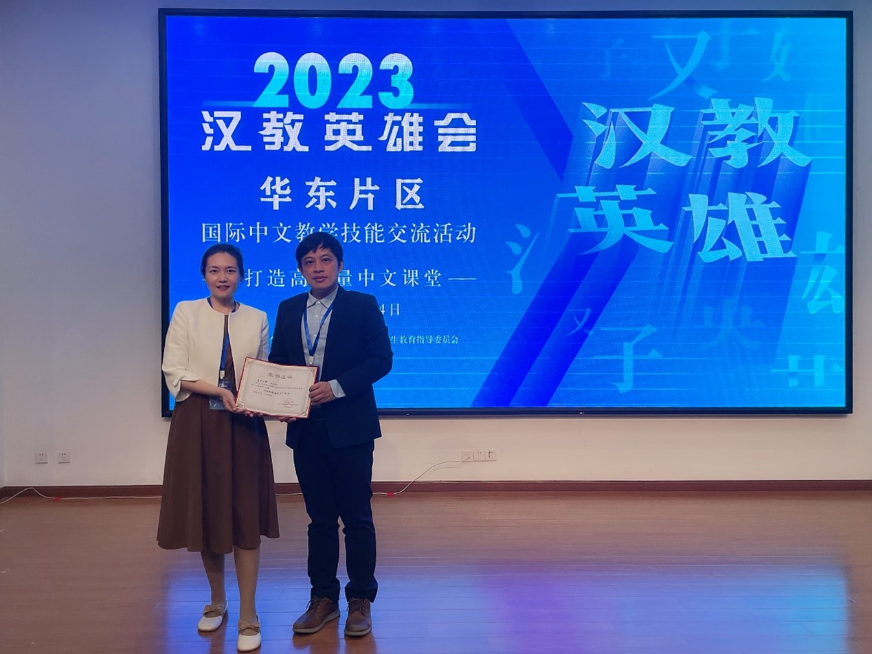 10月14日,由教育部中外语言交流合作中心、全国汉语国际教育专业学位研究生教育指导委员会联合主办的2023“汉教英雄会”华东片区国际中文教学技能交流活动在华东师范大学举办。此次交流活动收到来自7个省(市)、35所高校的43支队伍提交的教学材料,经过专家评审,华东师范大学、浙江大学、厦门大学等六支教师团队进入线下交流。厦门大学教师团队由我院洪镔、吕伯宁和彭涛三位老师组成,最终荣获“汉教教学能手”称号。