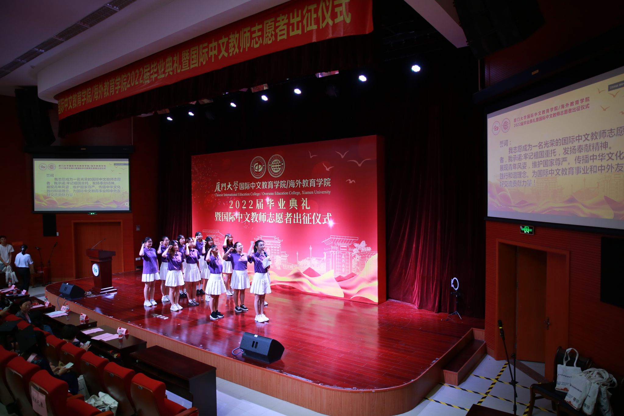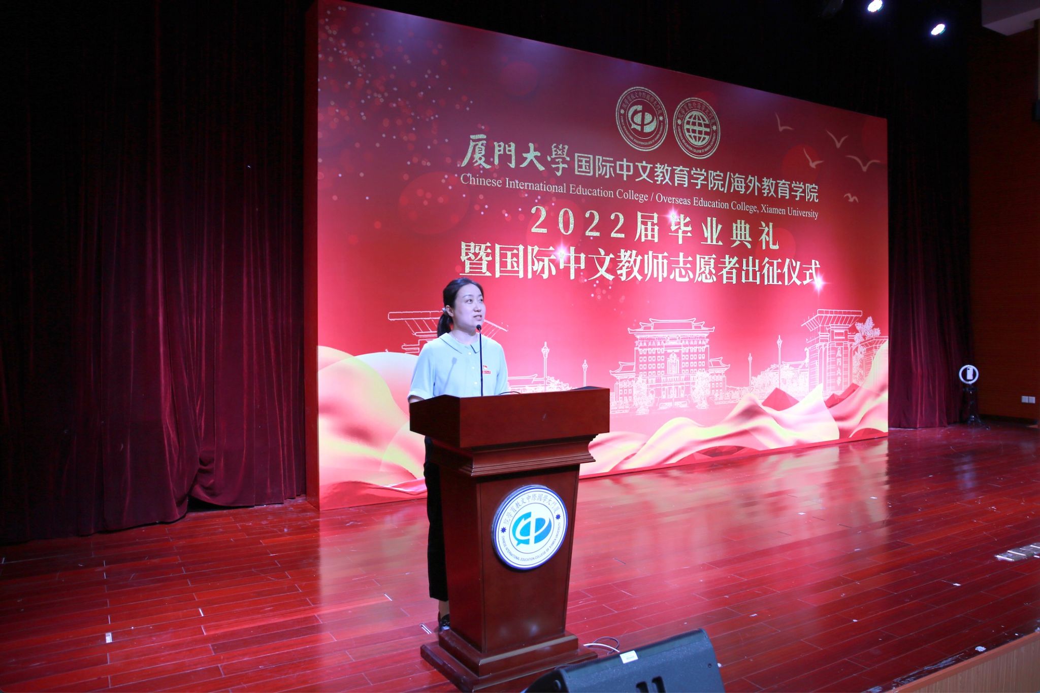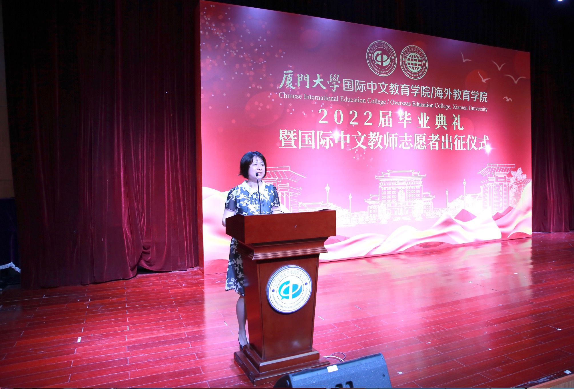 6月24日下午,厦门大学国际中文教育学院/海外教育学院于坤銮楼B102多功能厅举行2022届毕业典礼暨国际中文教师志愿者出征仪式,为方便境内外不在校的毕业生观礼,学院还在线上平台设置了分会场。院党委书记范丽、院长陈志伟、副院长耿虎、副院长潘超青、学院教师代表和2022届全体毕业生以及即将出征的国际中文教师志愿者参加典礼。本次典礼由学院党委副书记吴荻主持。