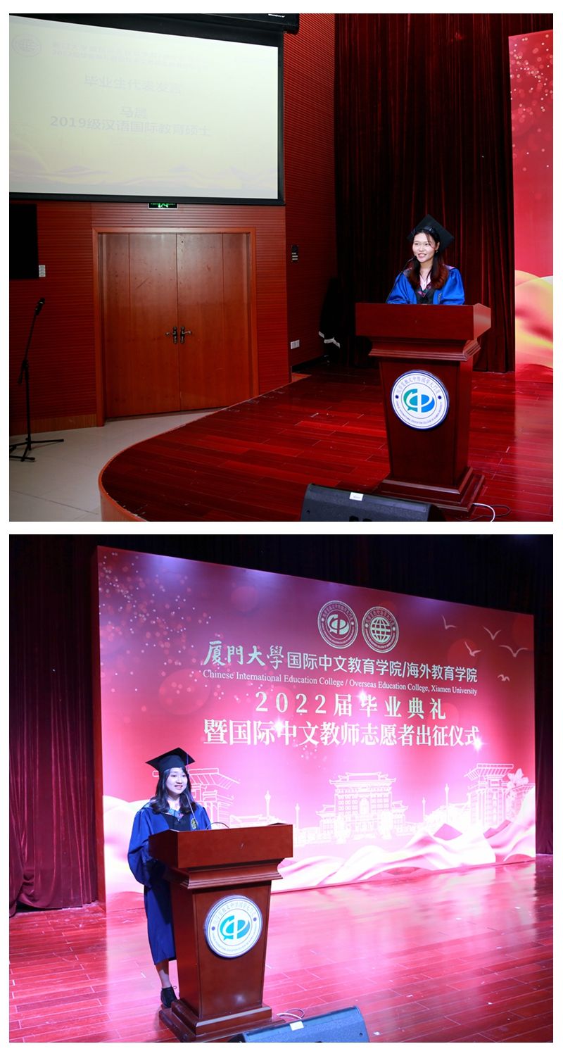国内毕业生马晨、来自泰国的毕业生吴艾贤作为毕业生代表依次发言。马晨表示,自己即将走向社会、走向教师岗位,必不敢忘却师之教诲,当力争上进,用囊萤之光为母校增色添彩。吴艾贤分享了与厦大结缘的故事,她承诺,自己会谨记厦大人的身份,努力弘扬嘉庚精神。回国以后,她将入职中资企业,为增进中泰友谊贡献自己的力量。