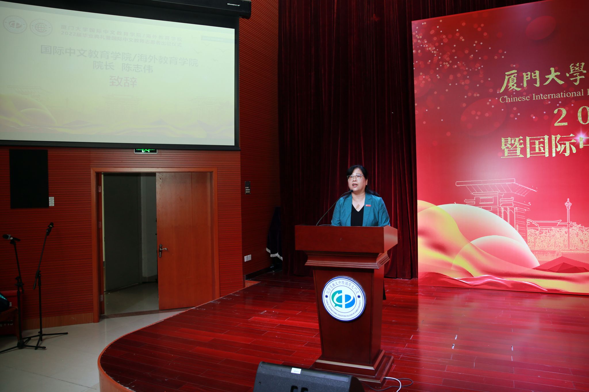 陈志伟首先致辞。她代表学院向各位毕业生致以热烈祝贺,向各位家长、老师致以诚挚敬意。她表示,几年前,大家跨越祖国大江南北,抑或远渡重洋,来到厦园追逐梦想。更有“瀚宇之花”志愿者团队,在疫情肆虐的风雨中勇毅前行,为推动中外文化交流互鉴、坚定中华文化自信作出了卓越贡献。陈院长给毕业生提出了几点临别嘱托:第一,坚定理想信念,牢记使命担当,将自己的人生追求和事业发展,与国家民族的繁荣昌盛紧密联系在一起;第二,秉承光荣传统,弘扬厦大精神,让自强不息、止于至善的校训精神和“爱国、革命、自强、科学”四种精神成为自己的灵魂底色;第三,不畏艰难险阻,赓续奋斗历程,不断提高自身的学习能力、适应能力,在波澜壮阔的新时代勇往直前。最后,陈院长深情寄语中外学子:凤凰花开,骊歌再起,学院永远向大家敞开怀抱。