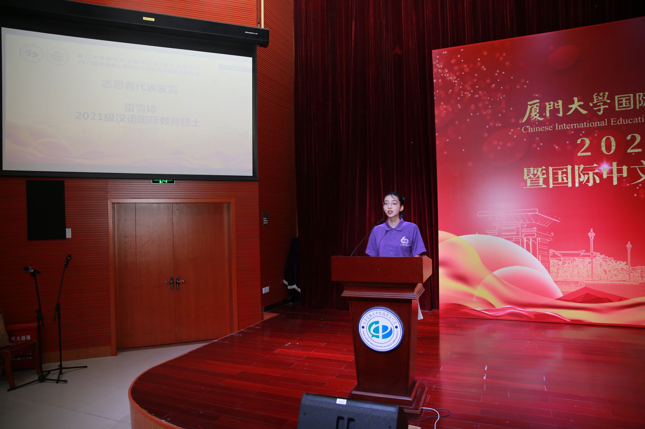 国际中文教师志愿者代表、2021级汉语国际教育硕士雷雪婷同学发言。她首先对学院和老师的辛勤培育、学长学姐所提供的帮助致以诚挚感谢,并分享了培训过程中印象最深刻的一句话:“与问题共存的能力很重要,永远要记住,人比事重要。”她表示,即使国际中文教育事业因国际形势变化而充满艰辛,但其想要传播中国故事的初心、对世界和平友好的期许依然滚烫。纵然前路坎坷,志愿者们必将披荆斩棘,乘风破浪!