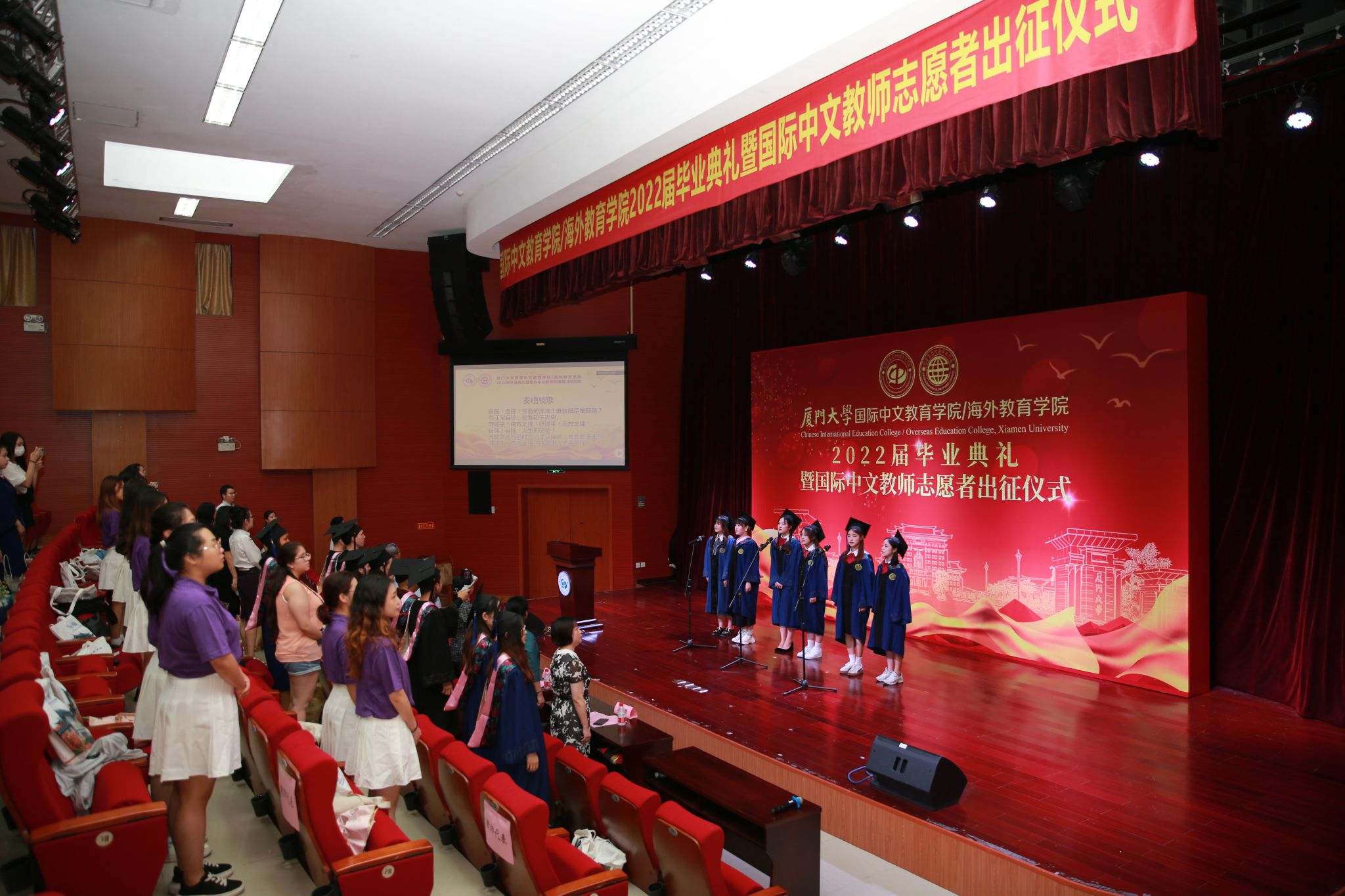 在雄壮的国歌声中,学院2022届毕业典礼暨国际中文教师志愿者出征仪式正式开始。