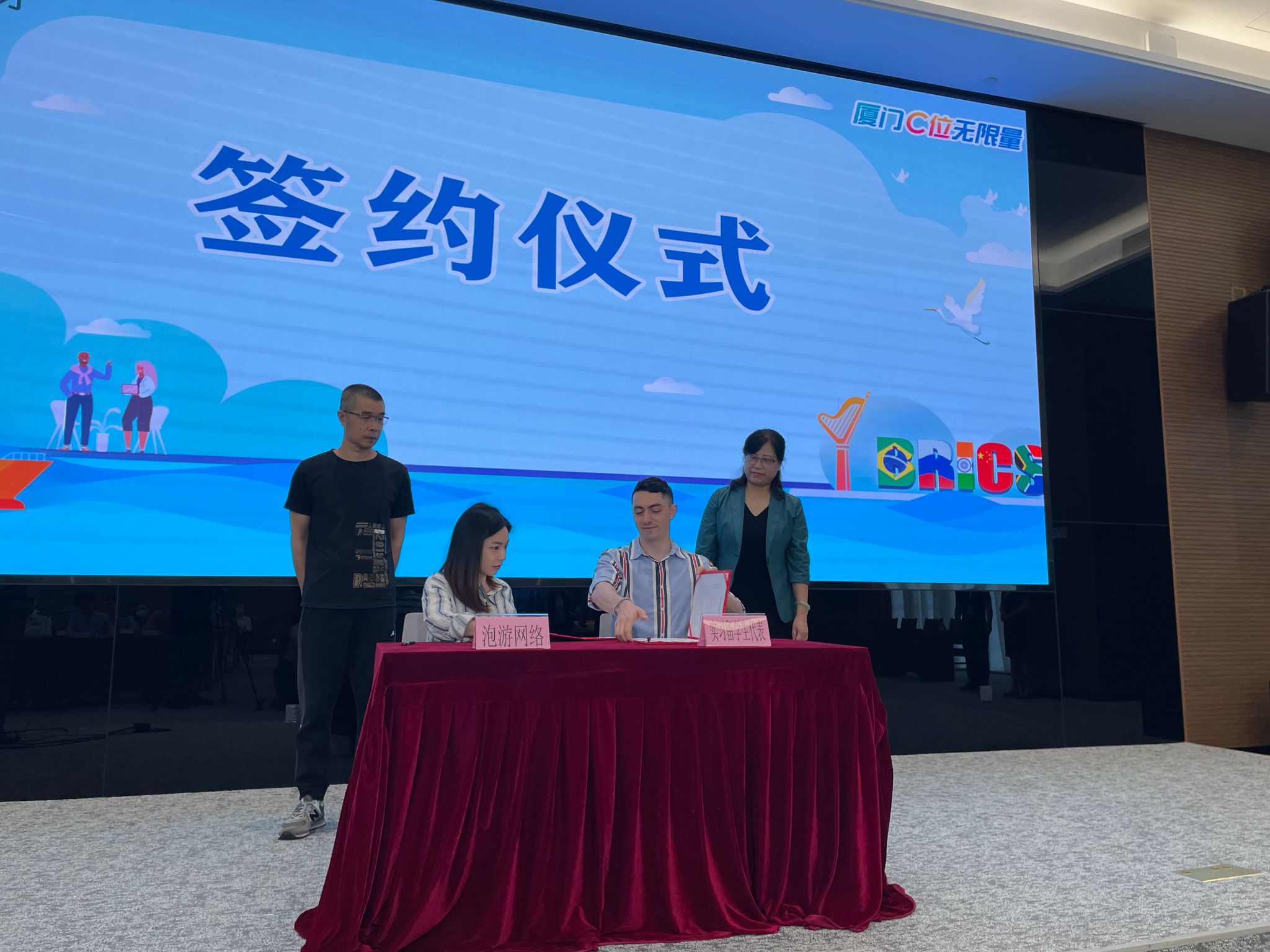 在揭牌仪式上,我院汉语言本科三年级的邵侯(丹尼尔•梅耶斯)作为留学生代表与泡游网络公司现场签订实习协议,我院院长陈志伟上台参与见证。
