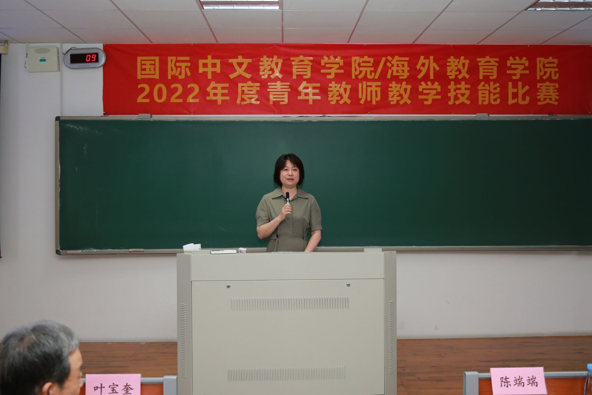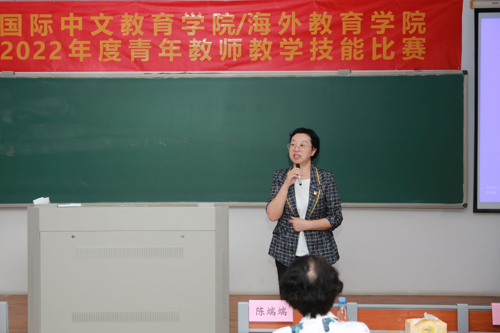 现场的比赛结束后,韩臻老师代表整个专家评委组对本届大赛进行了点评,她对学院参赛青年教师的专业素质、合作精神、创新意识和精神风貌给予了很高的评价。她指出,近年的疫情让国际中文教育行业经历了冰火两重天,教学形式从面授转向了线上教学。在目前线上教学的大环境中,教师需要思考如何在线上教学中传递知识点中隐含的交际信息和文化因素,把握规范的语言材料,提高汉语学习的吸引力,加强与学生的互动和联系。同时,在教学中,教师要做到以学生为主体,在了解学生的基础上把握汉语教学的重难点,充分提高自身的教学水平。