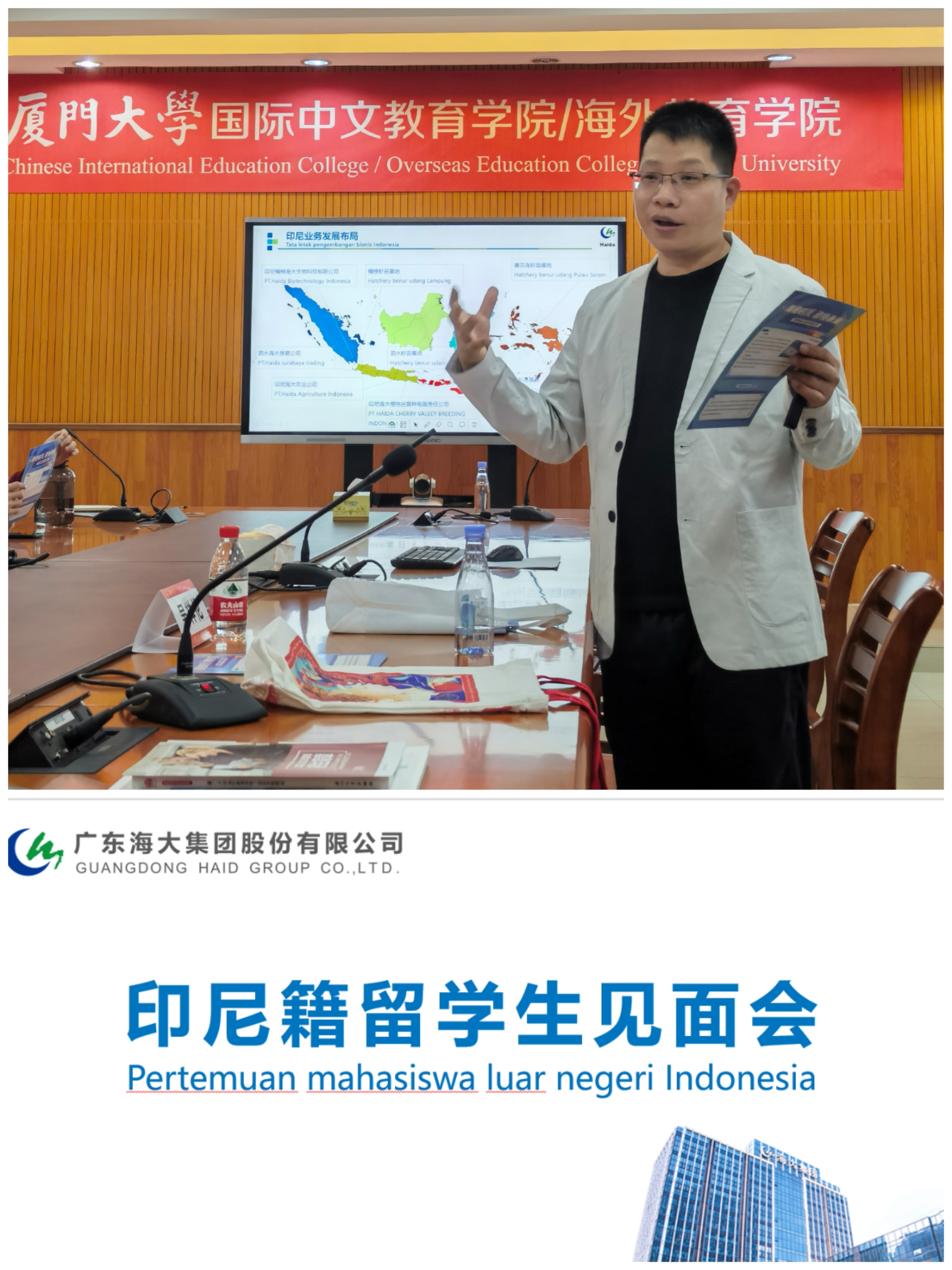 为切实做好国际学生就业指导工作,搭建国际学生和用人单位相互交流、双向选择的平台,11月13日下午,海大集团海大学院人力资源高级经理杨经勇和海大集团印尼海大农业公司二级技术服务工程师吴祥伦到访国际中文教育学院,于翔安校区坤銮楼C104举办印度尼西亚籍国际学生就业专场宣讲会,学院20余名高年级印尼本科生到场听取宣讲。