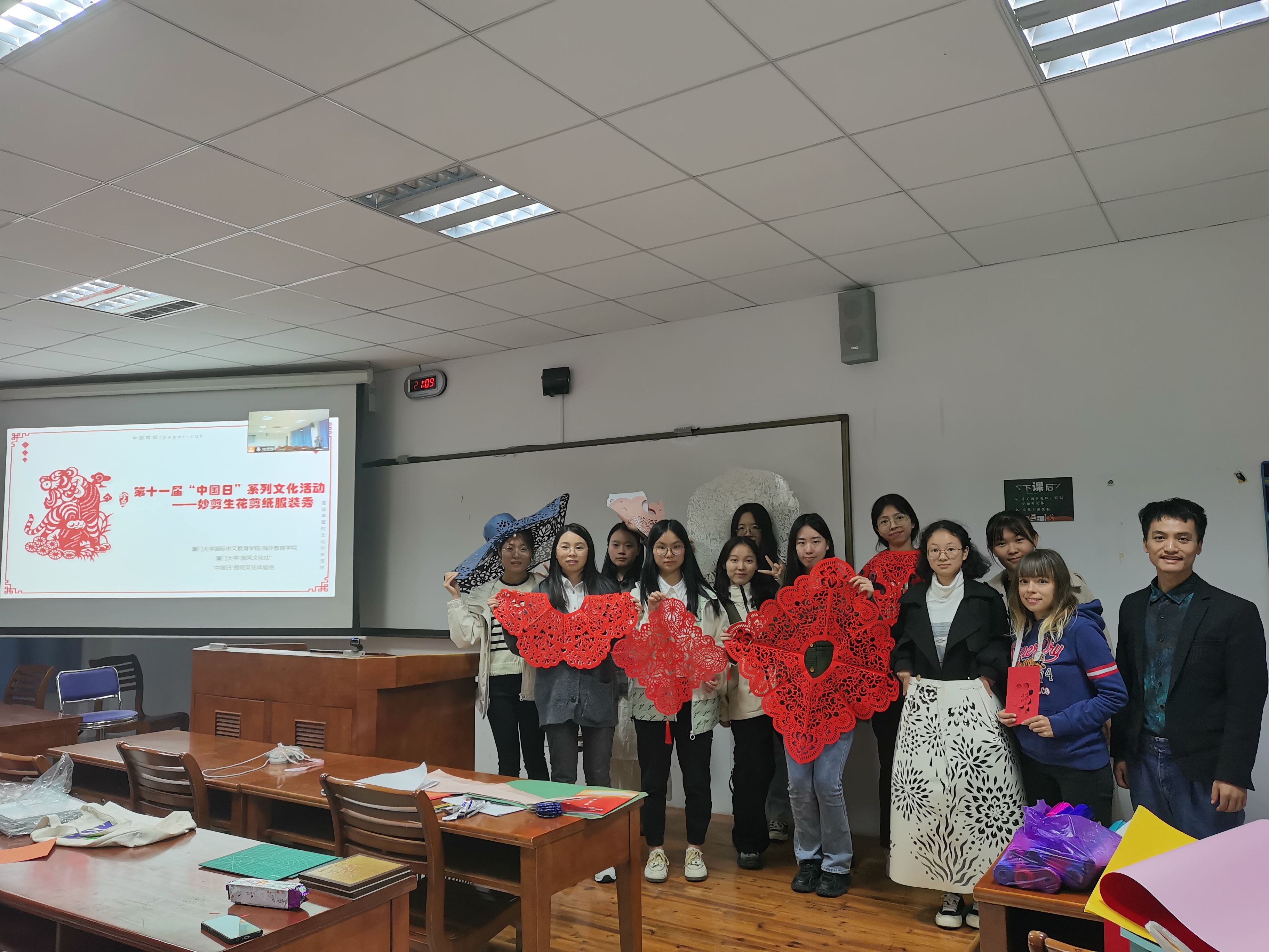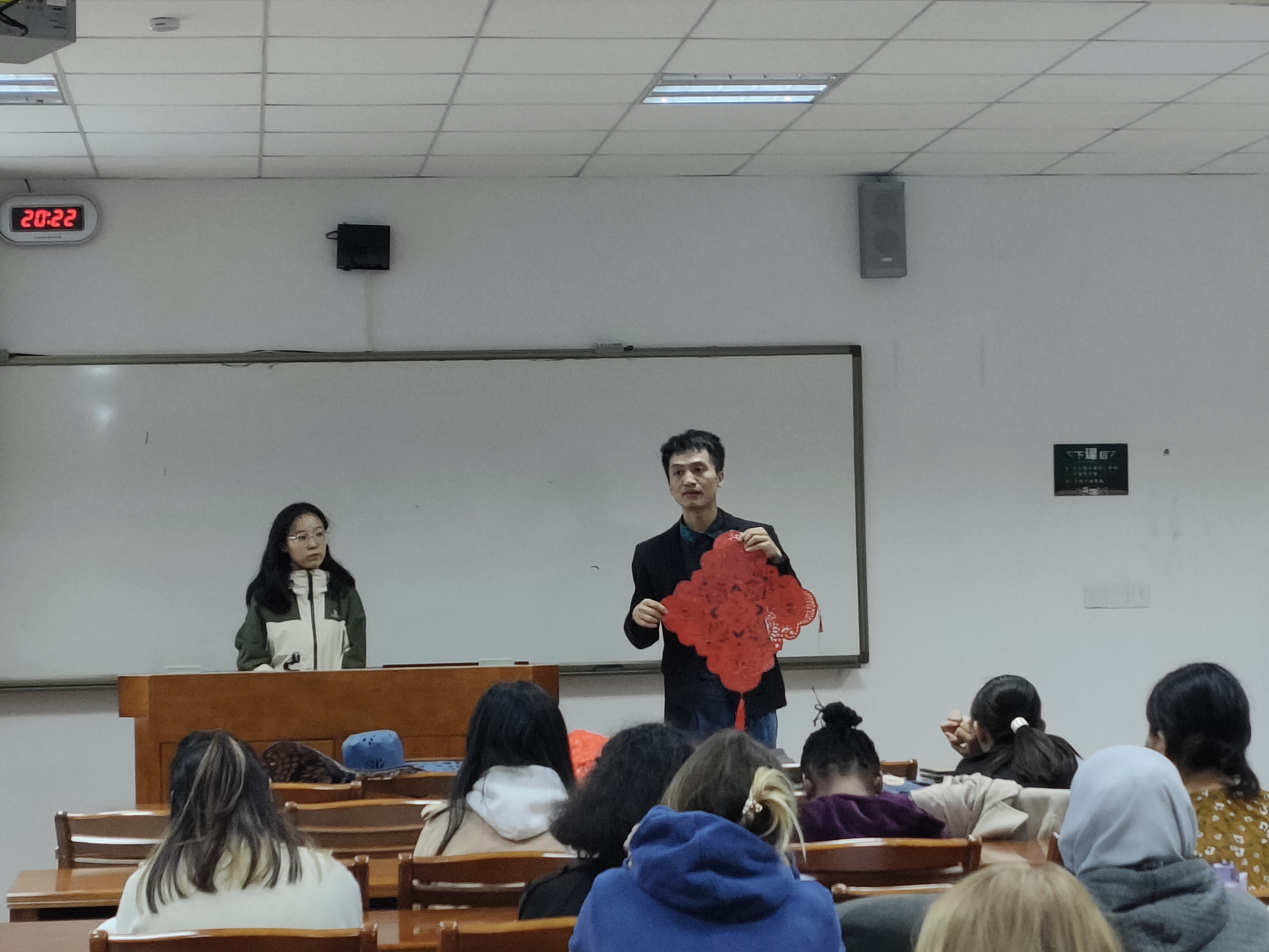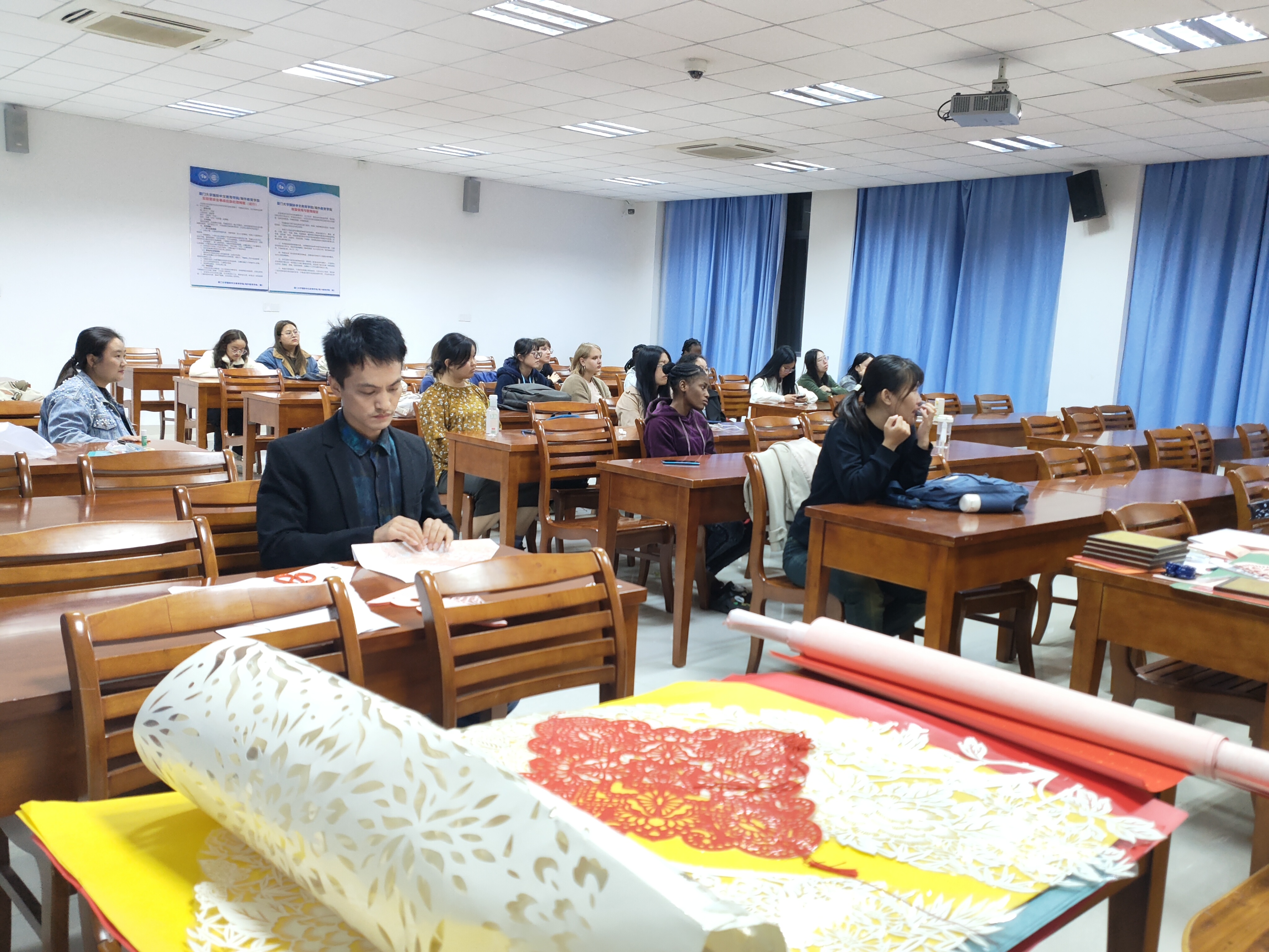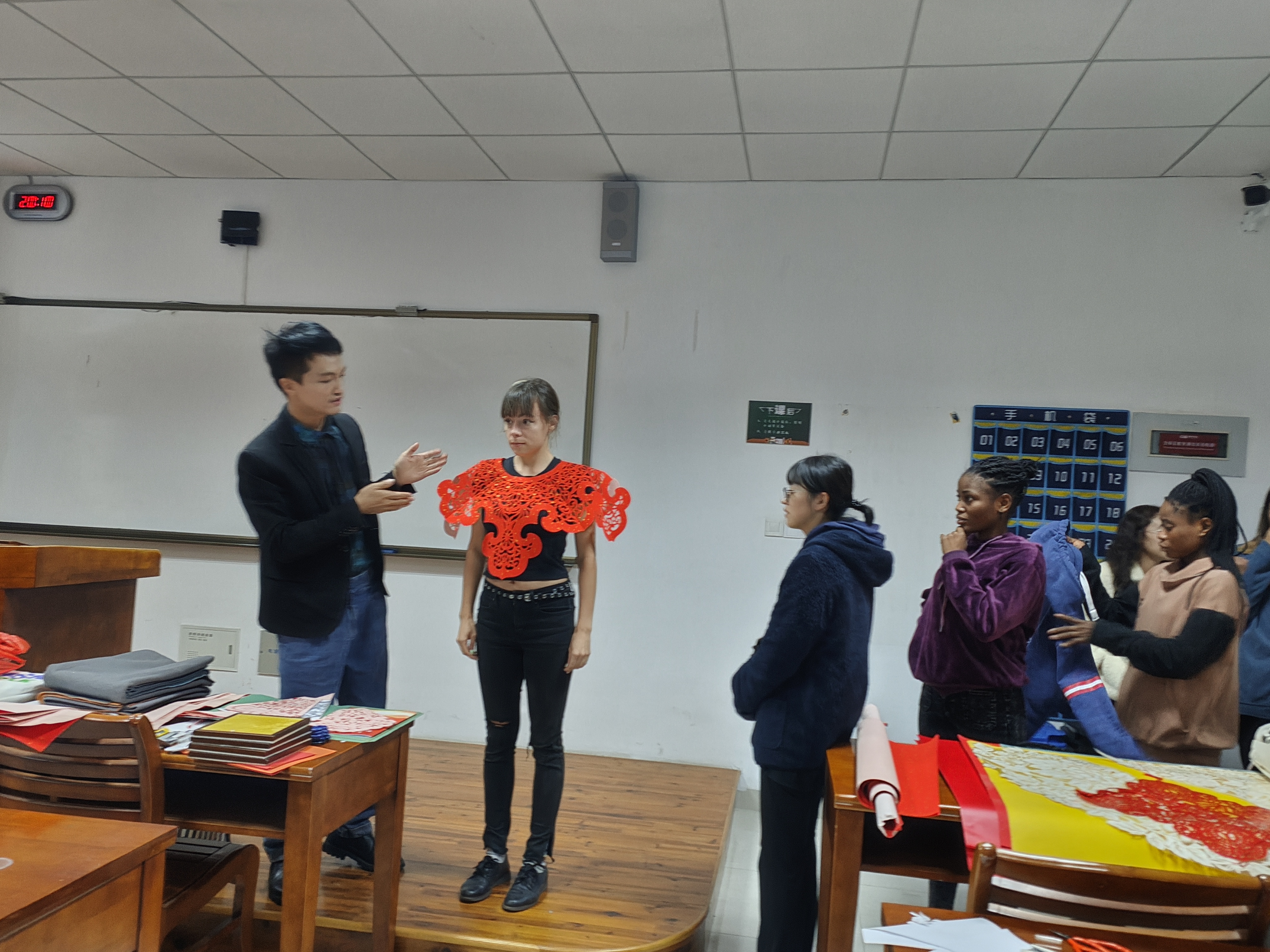中国传统剪纸艺术历史悠久,独具特色,是中国第二批入选“人类非物质文化遗产代表作名录”的民间艺术瑰宝。为传承和传播中华非遗文化,加深中外学生对剪纸艺术的理解,11月14日晚,国际中文教育学院/海外教育学院于翔安校区坤銮楼B211举办第十一届“中国日”系列文化活动——“妙剪生花”剪纸服装秀活动。漳浦剪纸非遗传承人黄际宇应邀出席指导,国际中文教育学院/海外教育学院肖宁遥、杨晓燕老师和学院部分中外学生参加活动。