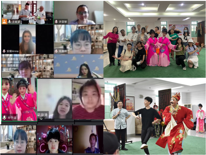 泉腔弦管,曲自南音,兰指科步,步步生莲。扮演花旦的青年演员在颇具特色的泉腔管弦乐中闪亮登场,她脚下的科步轻巧灵动,如踏葳蕤。公子小姐的情深缱绻让学员们沉醉,但高甲戏特色的丑角更是让学员们大开眼界。打破了丑角行当的藩篱,高甲戏以“丑”为美,大量的丑角独具特色,甚至有大量的剧目正是以丑角为主演。提线木偶丑、掌中木偶丑、公子丑诙谐幽默,叫人捧腹;女丑的夸张肢体语言常逗得看客乐不可支;而武丑惊险的翻跳动作更是在夺人眼球的同时让人忍俊不禁。众“丑”齐聚一堂,以丑角的幽默风趣演尽了人生百态,嬉笑怒骂,叫人笑声在口,余韵在心。研修以结合精彩戏曲表演的文化讲解为主线,融合有趣的互动问题进行线上线下的实时考察,让同学们在欣赏艺术盛宴的同时进行戏曲文化的积累。