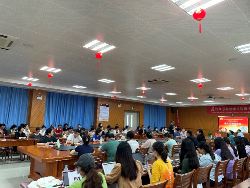 5月30日下午,厦门大学国际中文教育学院/海外教育学院在坤銮楼C104会议室开展了双周政治理论学习活动。厦门大学历史系张侃教授应邀为学院师生做了题为“如何树立正确的党史观?———谈谈理解《中共中央关于党的百年奋斗重大成就和历史经验的决议》的历史脉络”的讲座。本次讲座由我院党委书记范丽主持,学院党政班子成员、全体教师、学生党员代表共同聆听了本次讲座。