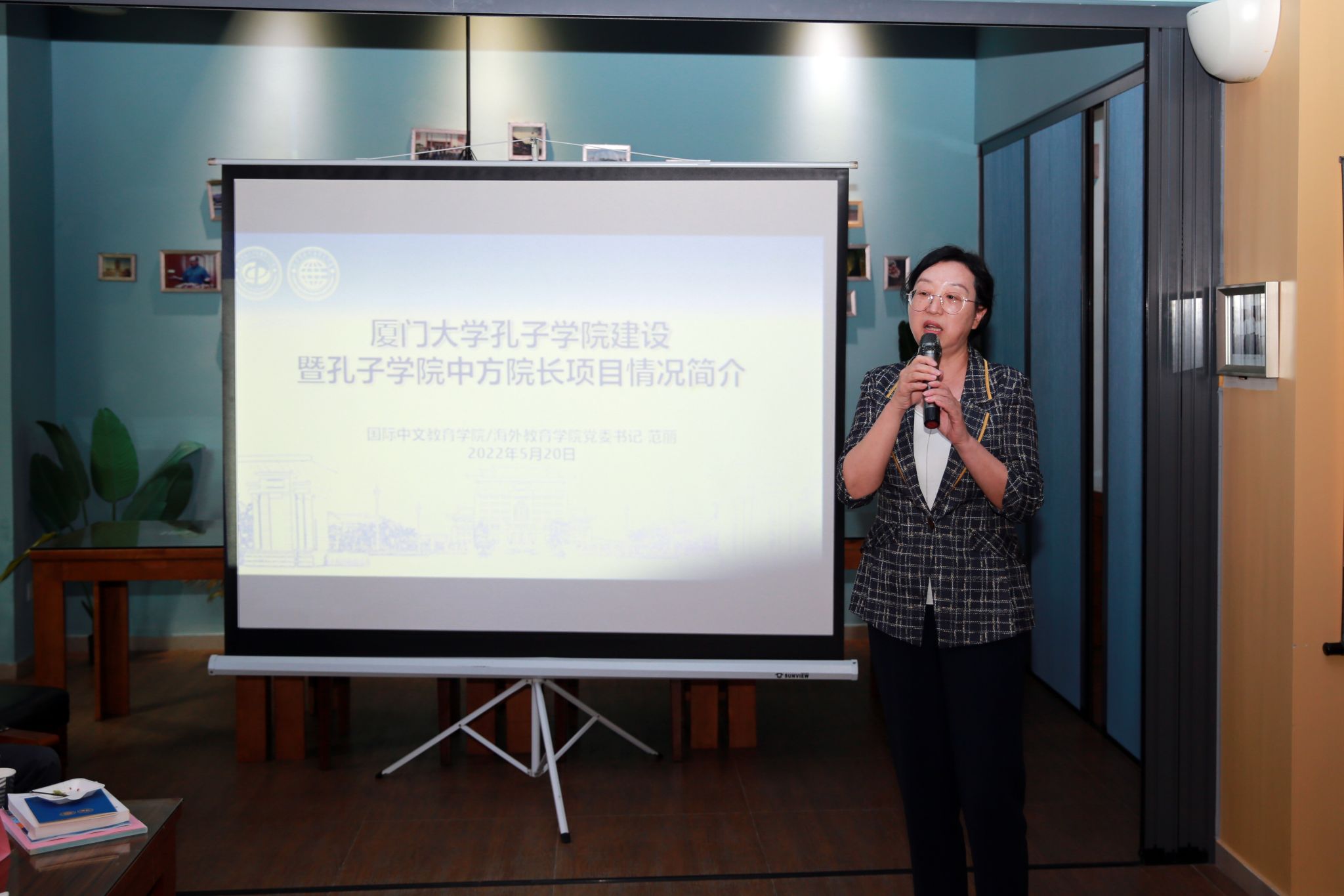 最后,国际中文教育学院/海外教育学院党委书记范丽介绍了我校孔子学院建设暨孔子学院中方院长项目情况。她指出,在习近平总书记致厦门大学百年校庆贺信中,充分肯定了我校在推动中华文化海外传播方面做出的积极贡献,孔子学院是中华文化海外传播的重要平台。