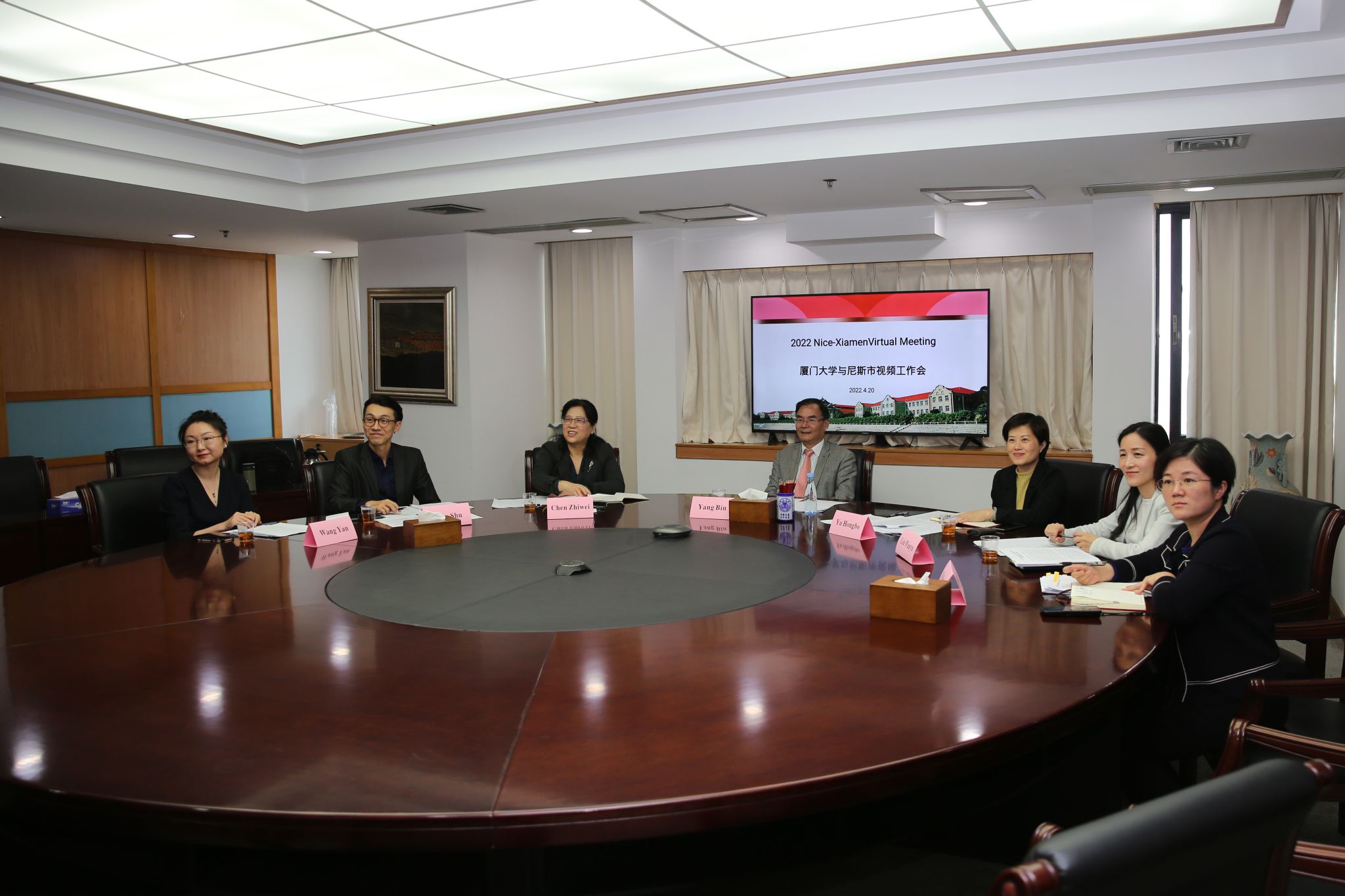 2022年4月20日下午,应厦门市人民政府外事办公室和法国尼斯市政府国际关系局的邀请,杨斌副校长代表我校出席两市视频工作会议,与尼斯市政府及蔚蓝海岸大学共同商讨语言、文化、艺术等方面合作。市外办主任张权、市友协秘书长游黎萍,尼斯市议员斯特凡·高梅、尼斯市国际关系局亚洲处处长张明、蔚蓝海岸大学联盟副校长塞西丽·萨布霍尔,以及我校海外办学办执行主任/国际合作与交流处副处长余宏波、副处长刘婉玉等一同出席会谈。会议分为两个阶段,厦门大学与尼斯方代表的座谈会由我校国际中文教育学院/海外教育学院院长陈志伟主持。