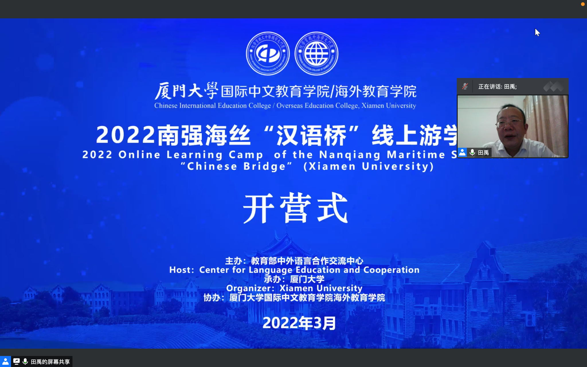 2022年3月26日晚,由教育部中外语言交流合作中心主办、厦门大学国际中文教育学院/海外教育学院、厦门大学中外语言交流合作中心承办的南强海丝“汉语桥”(欧非)线上游学营顺利结营。结营仪式由厦门大学国际中文教育学院/海外教育学院田禹老师主持,担任此次游学营班主任之一的王彦老师出席,来自埃及、老挝、加纳、墨西哥的学员们与老师们一齐相聚云端,为游学营画上圆满的句号。