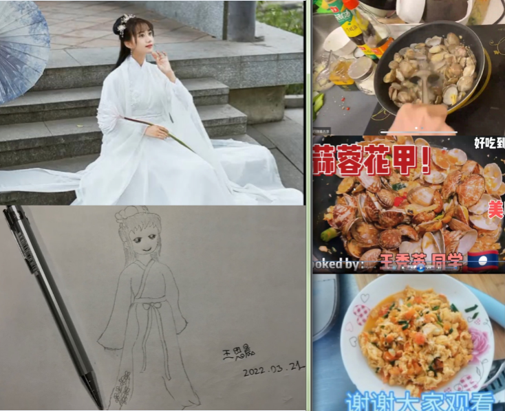 在结营仪式上,老师们播放了学员们精心制作的VLOG,大家一起回顾了这10天的线上学习历程。学员们在视频中回忆了在游学营中学到的语言与文化知识,展现对汉语学习的热情和对中国文化的热爱。来自老挝的江小峰和王秀英在视频中分别展示了西红柿炒鸡蛋和蒜蓉花甲的做法,精湛的厨艺令老师和其他学员们赞不绝口;来自老挝的王思晨利用相机的延时功能记录下自己的绘画汉服的过程;来自加纳的Rita利用彩笔和纸张,亲手制作了她眼中的汉服美女……学员们用视频展现对中国文化的理解,也用视频表达对老师们辛苦付出的感谢。
