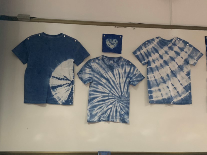 在体验环节,同学们充分发挥想象力,进行自由创作,大家热情满满,创意无限,白色的衣服经过不同形式的捆绑勒扎与浸泡染色,化身为图案各异的扎染作品,在场师生不时发出阵阵惊讶。