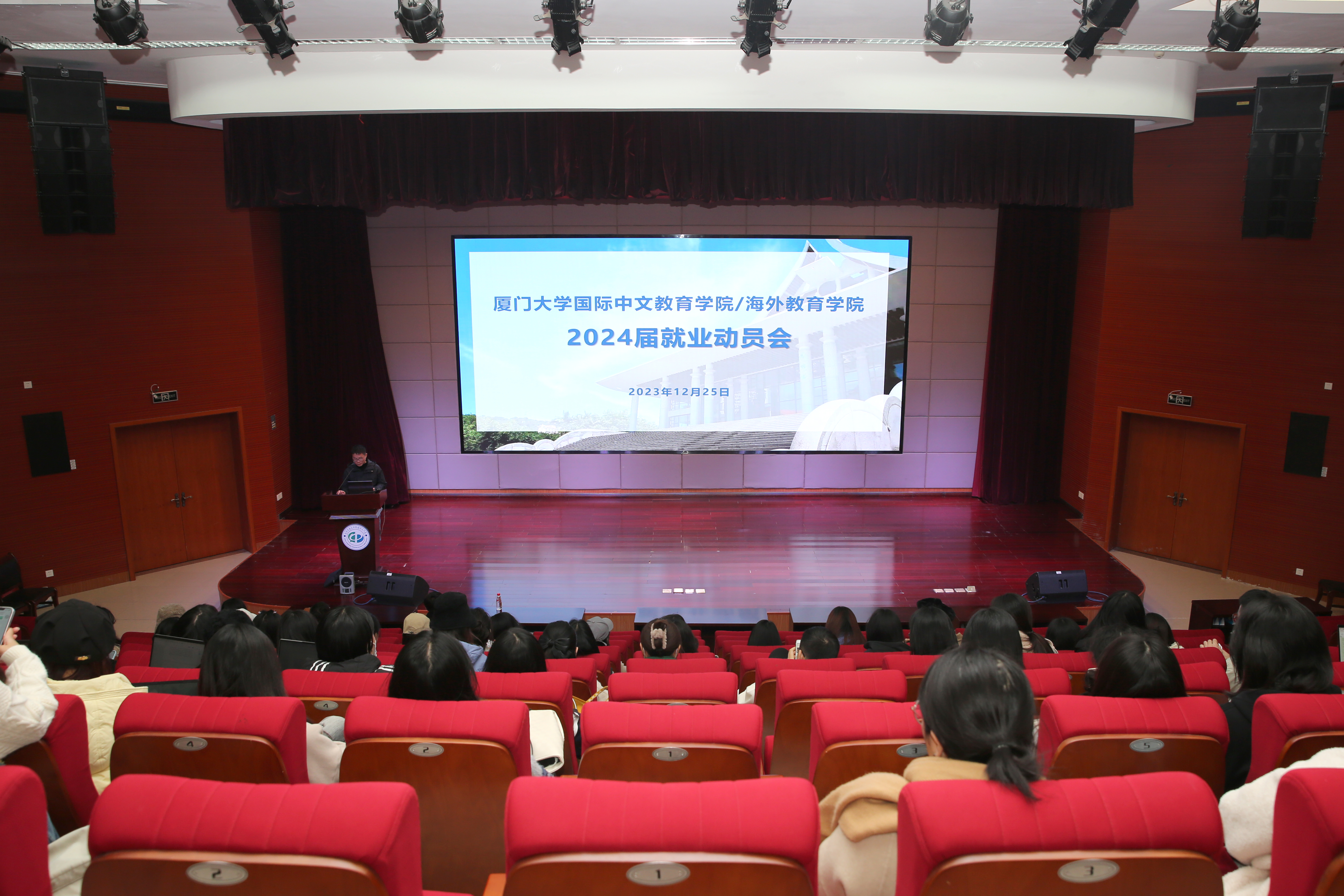 为贯彻落实学校第十二次党代会精神,构建高质量就业育人体系,推进学院2024届毕业生就业创业工作,12月25日下午,国际中文教育学院/海外教育学院在翔安校区坤銮楼B102多功能厅召开2024届毕业生就业动员大会。学院党委副书记林明华、团委书记陈艺新、辅导员姜立恒和全体在校研究生参加会议。