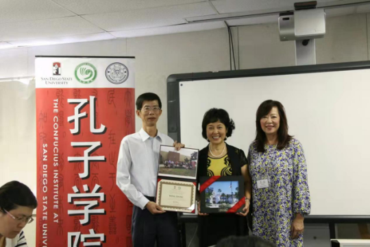 图为卢老师在美国圣地亚哥州立大学孔子学院