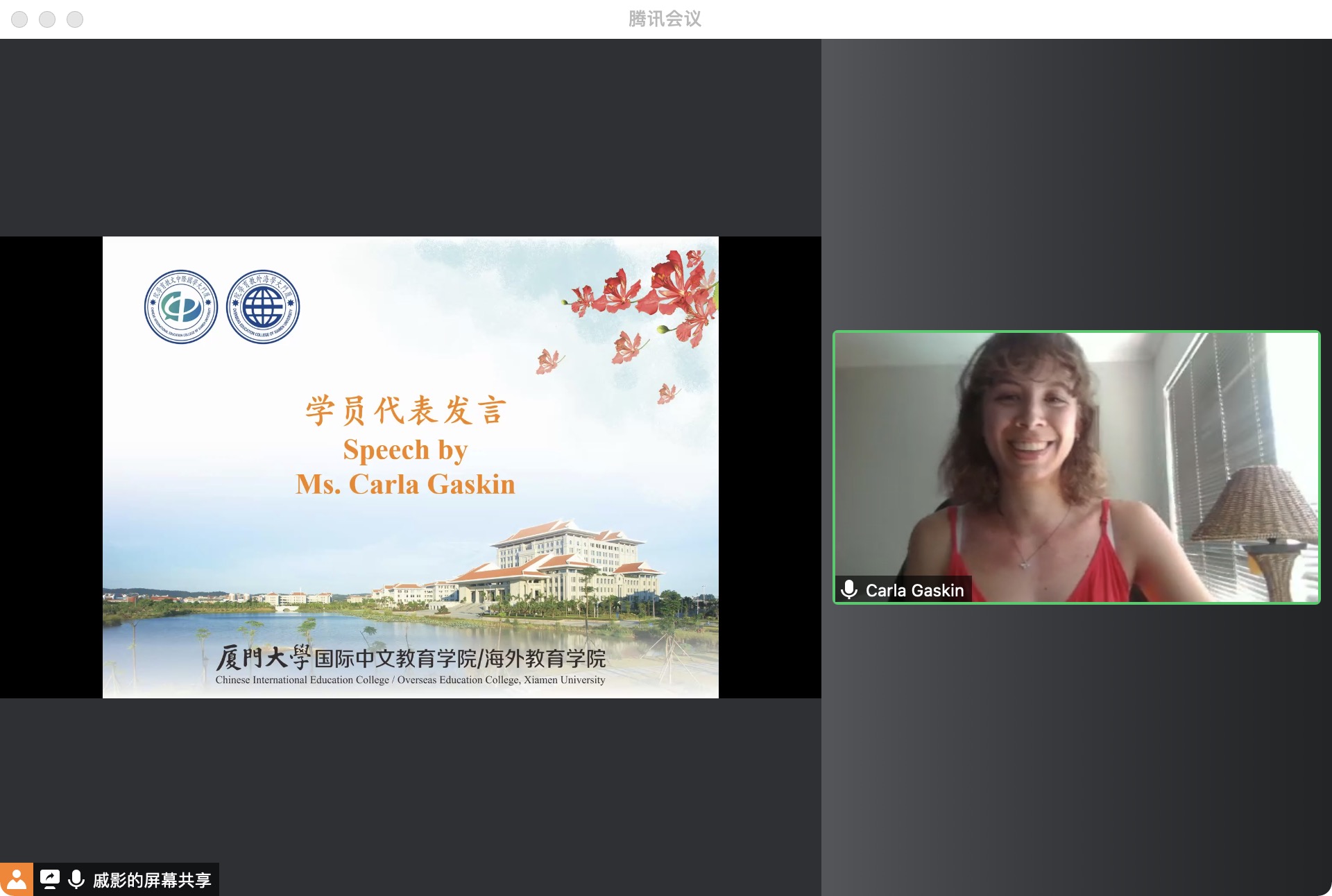 随后,参加此次线上游学营的学员代表,来自南非斯坦陵布什大学中文系的学生Carla Gaskin用汉语发言。Carla表示尽管学习语言非常具有挑战性,但她仍对学习汉语充满了激情,希望通过此次游学营可以增加对汉语的了解,进一步丰富自己的中国知识。在发言中,Carla还代表营员们向教育部中外语言交流合作中心以及厦门大学的老师们表达了衷心的感谢。