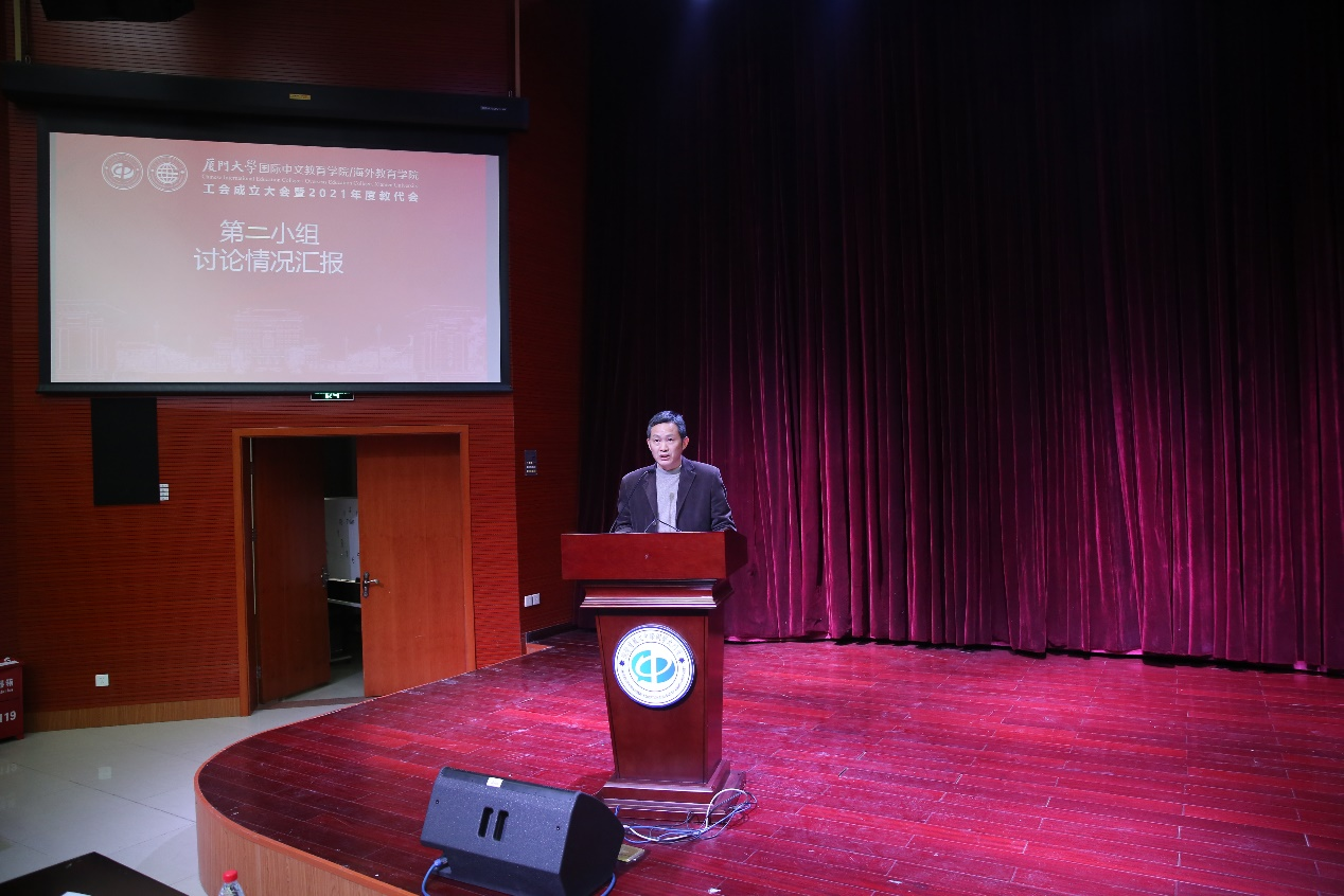 在听取报告后,参会人员于指定地点分四组进行讨论、审议。洪镔、刘强、林琳、洪伟分别代表各组发言,发言中大家均充分肯定了会上所做的报告,纷纷表示报告站位立意高,凝聚人心,鼓励士气,催人奋进,呈现学院情况实事求是,谈及问题不遮不掩,谋划举措重点突出,展望未来思路清晰。同时,发言代表们还分享了各组教职员工在招生宣传、学科发展、科研团队建设、校友工作、华文系与专职教师队伍融合、学生工作等多方面的意见建议。