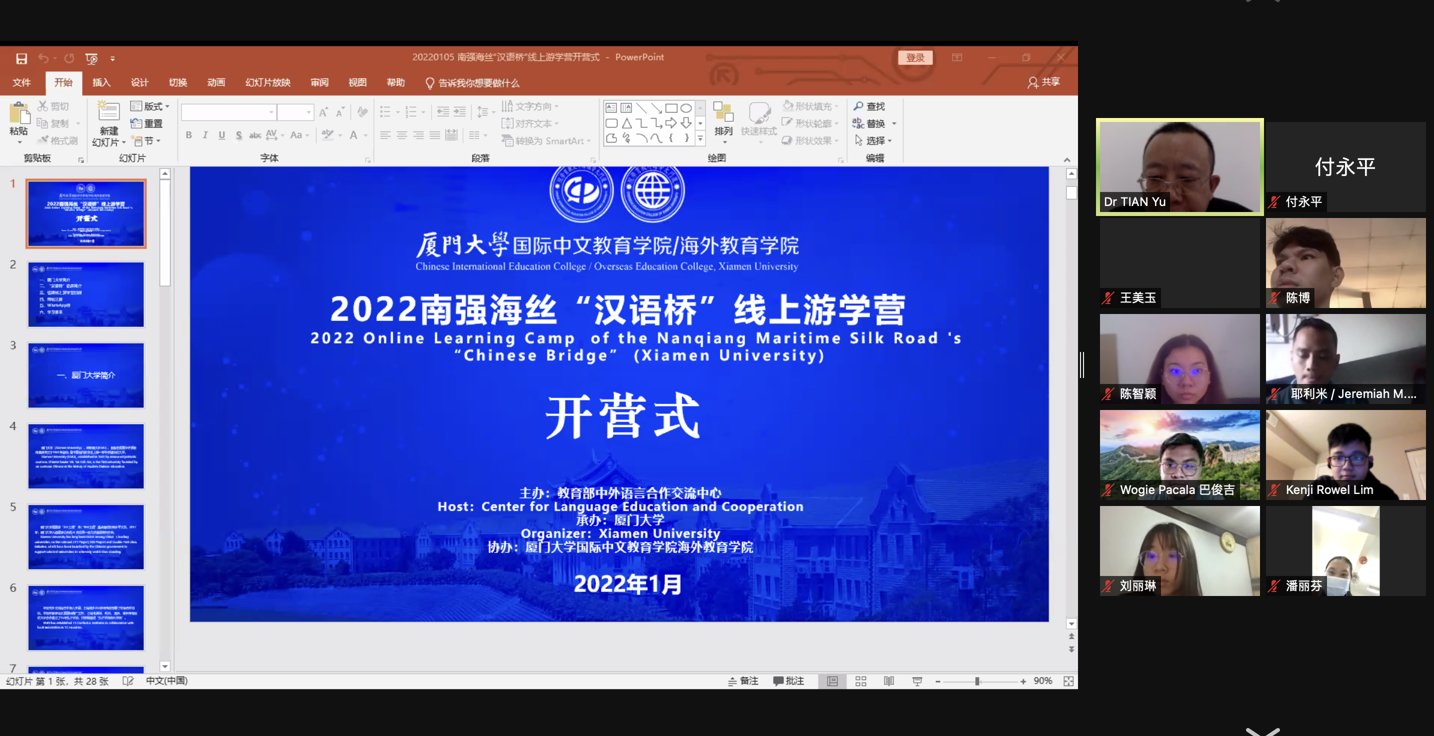 2022年1月5日上午,由教育部中外语言交流合作中心主办、厦门大学国际中文教育学院/海外教育学院承办的2022南强海丝“汉语桥”线上游学营顺利开营。开营仪式由厦门大学国际中文教育学院/海外教育学院田禹老师主持,在厦门大学国际中文教育学院/海外教育学院举行,来自菲律宾、泰国、土耳其等国学员齐聚云端,同游中国。