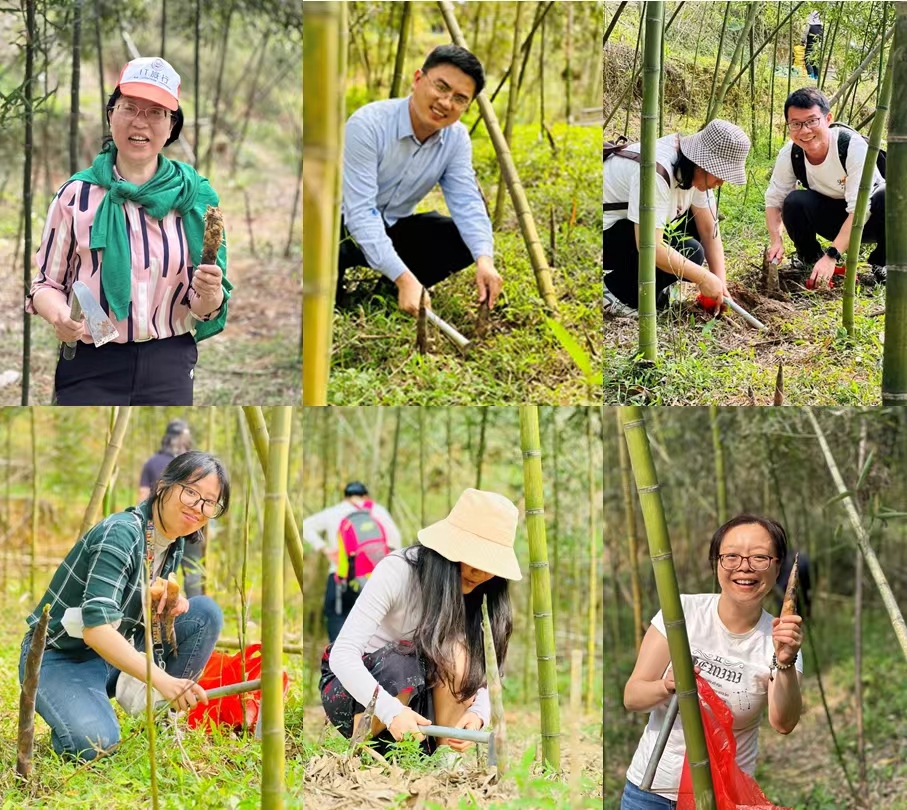 下午,大家来到竹林里体验挖竹笋的劳动乐趣,感受春天大自然带来的馈赠,男女老少都忙得不亦乐乎。