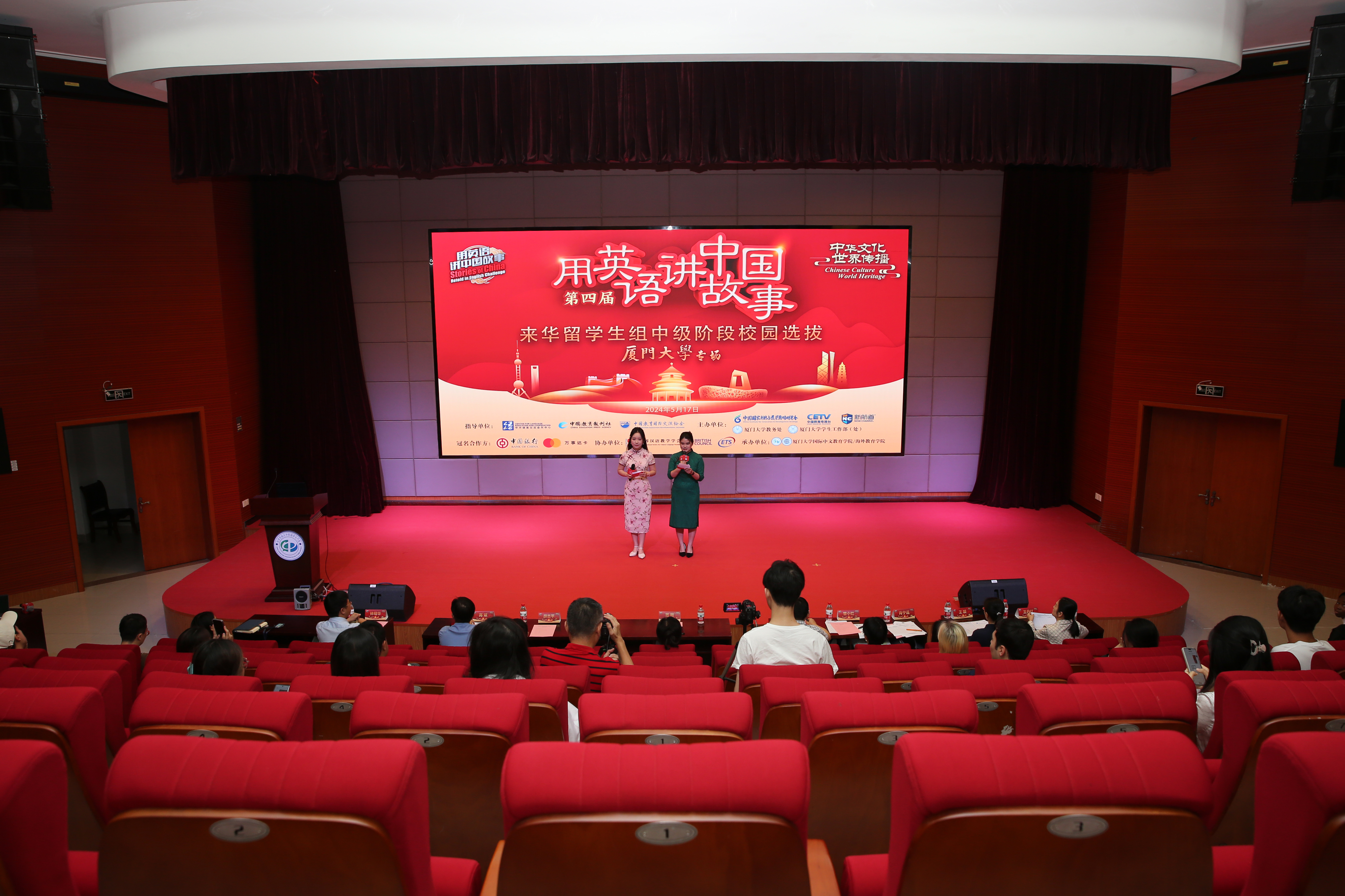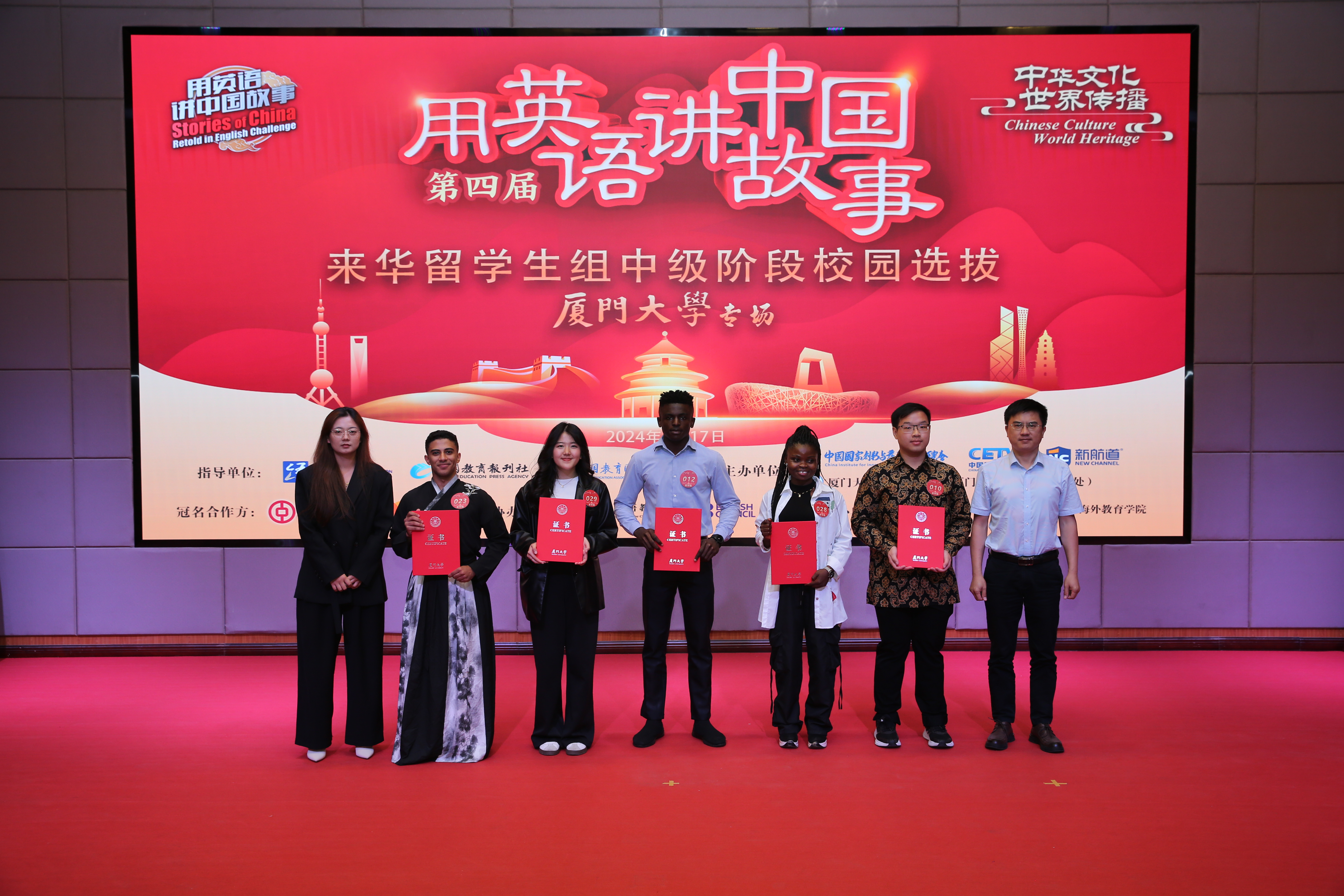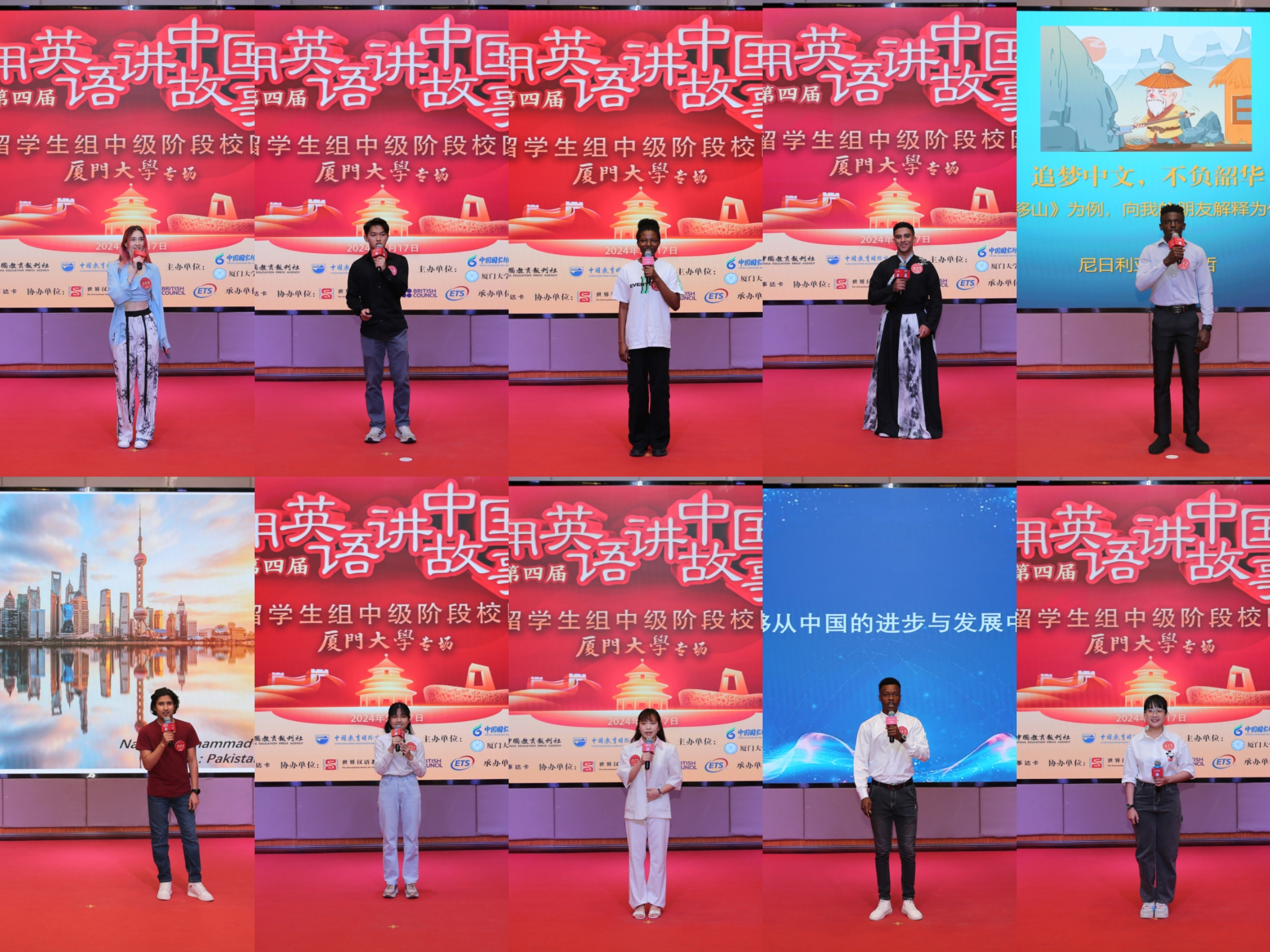 据悉,第四届“用英语讲中国故事”活动由教育部中外语言交流合作中心、中国教育报刊社、中国教育国际交流协会指导,中国国家创新与发展战略研究会、中国教育电视台、新航道国际教育集团联合主办,活动面向国内高中、大学、来华留学生以及海外留学生,旨在引领更多青少年成为中国故事的讲述者、中华文化的传播者。本次中级阶段选拔赛是首次由部分高校线下承办,同时,活动也是第三届厦门大学“慧识中国”国际学生汉语应用大赛决赛,由厦门大学教务处、学生工作处共同主办,国际中文教育学院/海外教育学院承办。