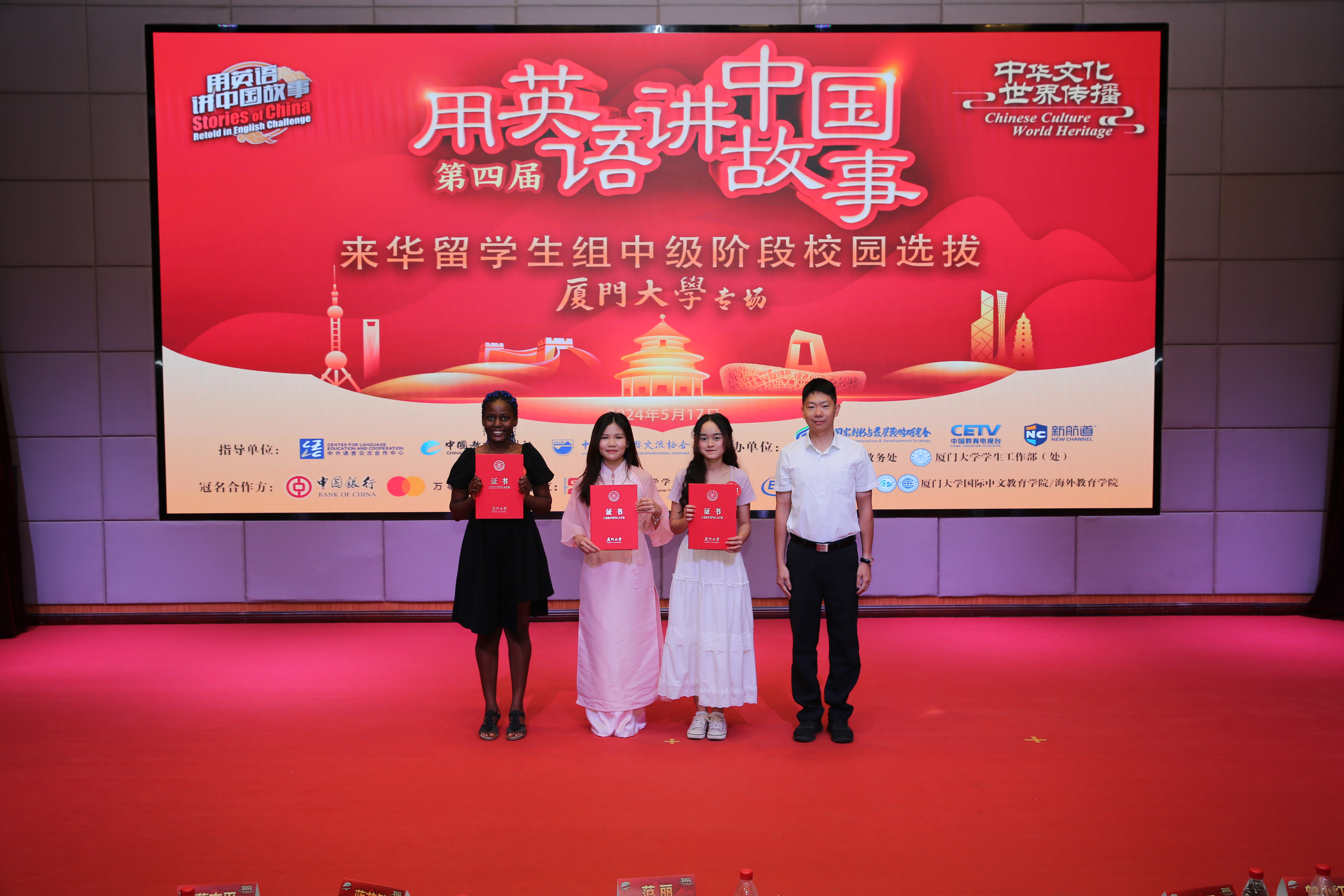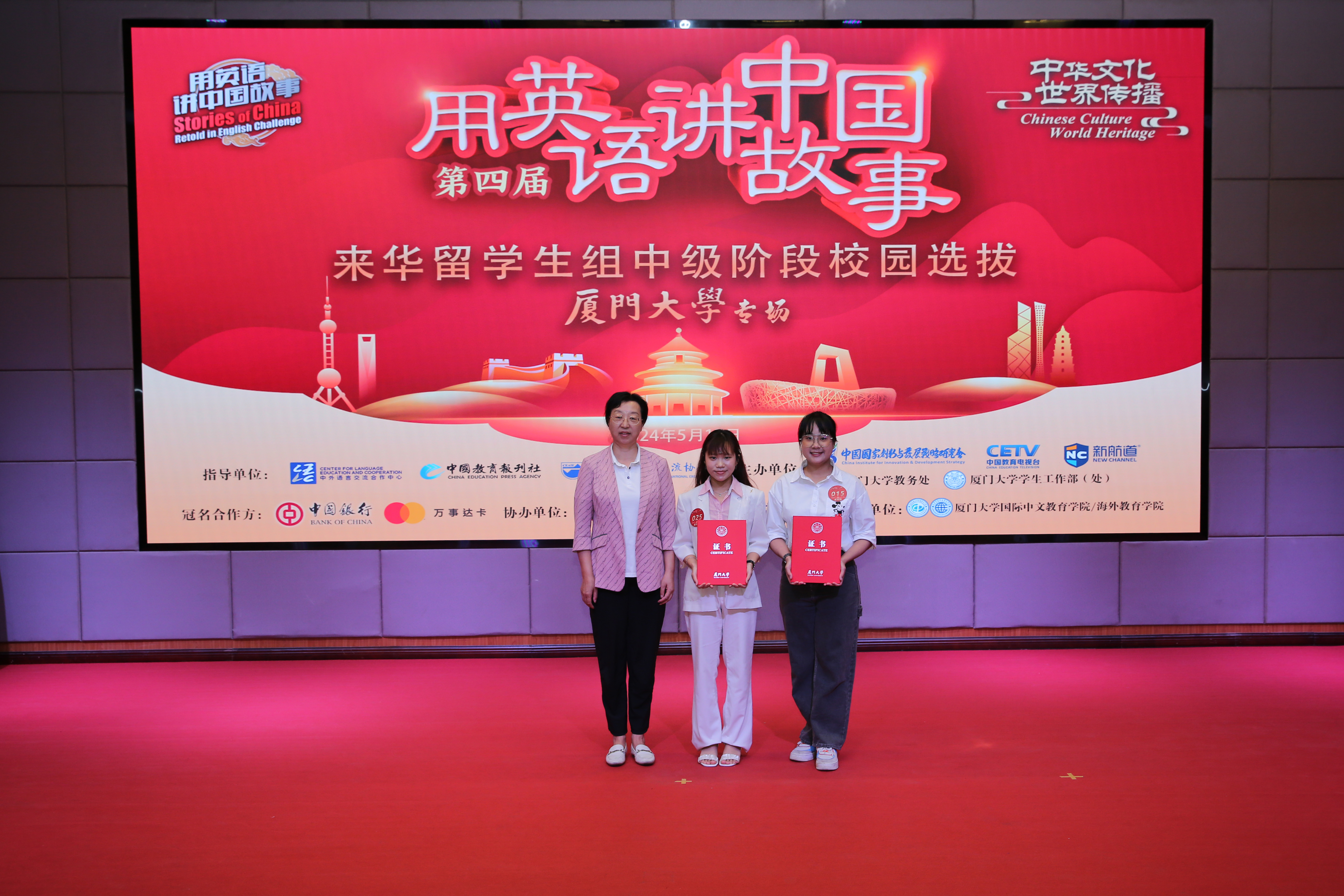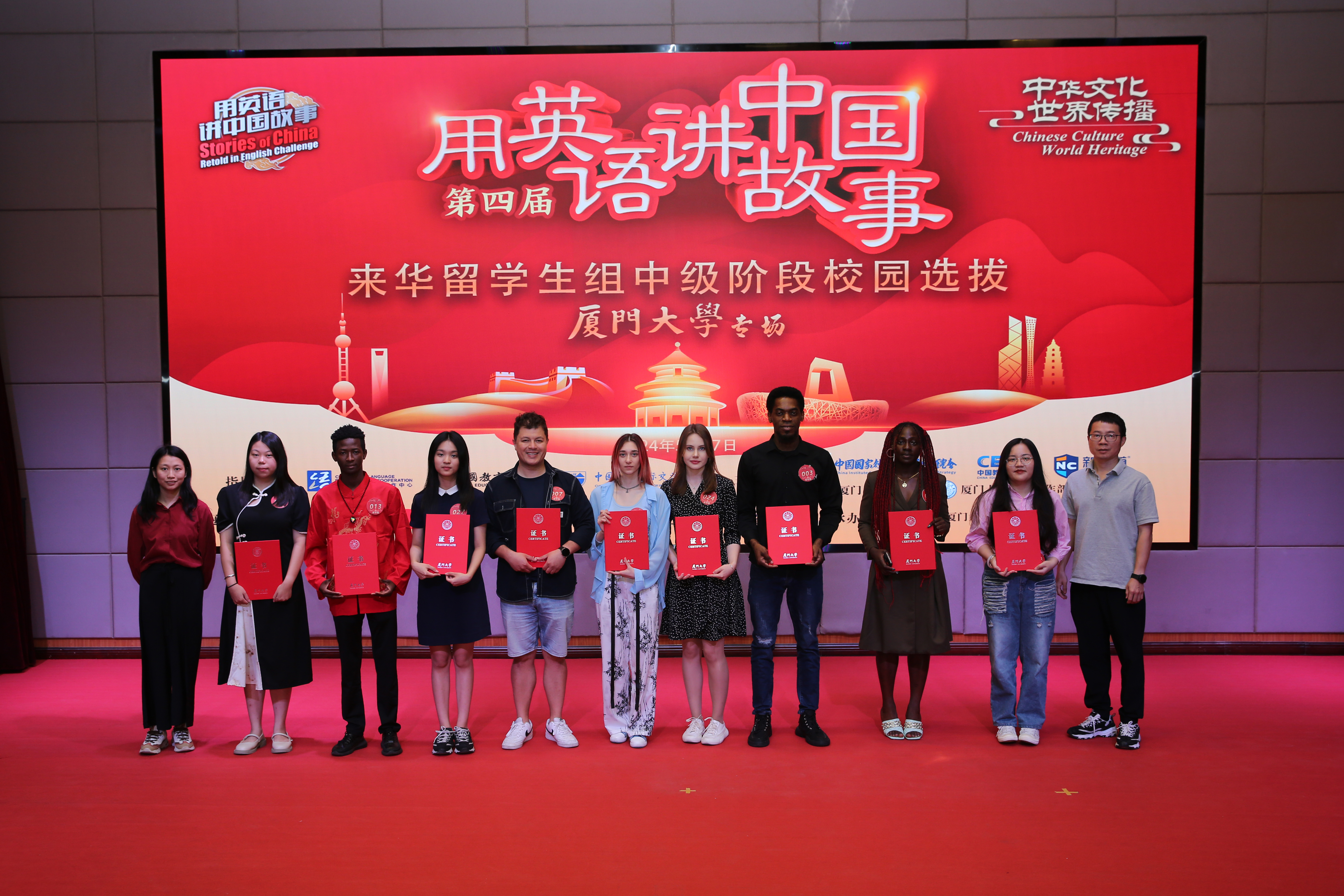据悉,第四届“用英语讲中国故事”活动由教育部中外语言交流合作中心、中国教育报刊社、中国教育国际交流协会指导,中国国家创新与发展战略研究会、中国教育电视台、新航道国际教育集团联合主办,活动面向国内高中、大学、来华留学生以及海外留学生,旨在引领更多青少年成为中国故事的讲述者、中华文化的传播者。本次中级阶段选拔赛是首次由部分高校线下承办,同时,活动也是第三届厦门大学“慧识中国”国际学生汉语应用大赛决赛,由厦门大学教务处、学生工作处共同主办,国际中文教育学院/海外教育学院承办。