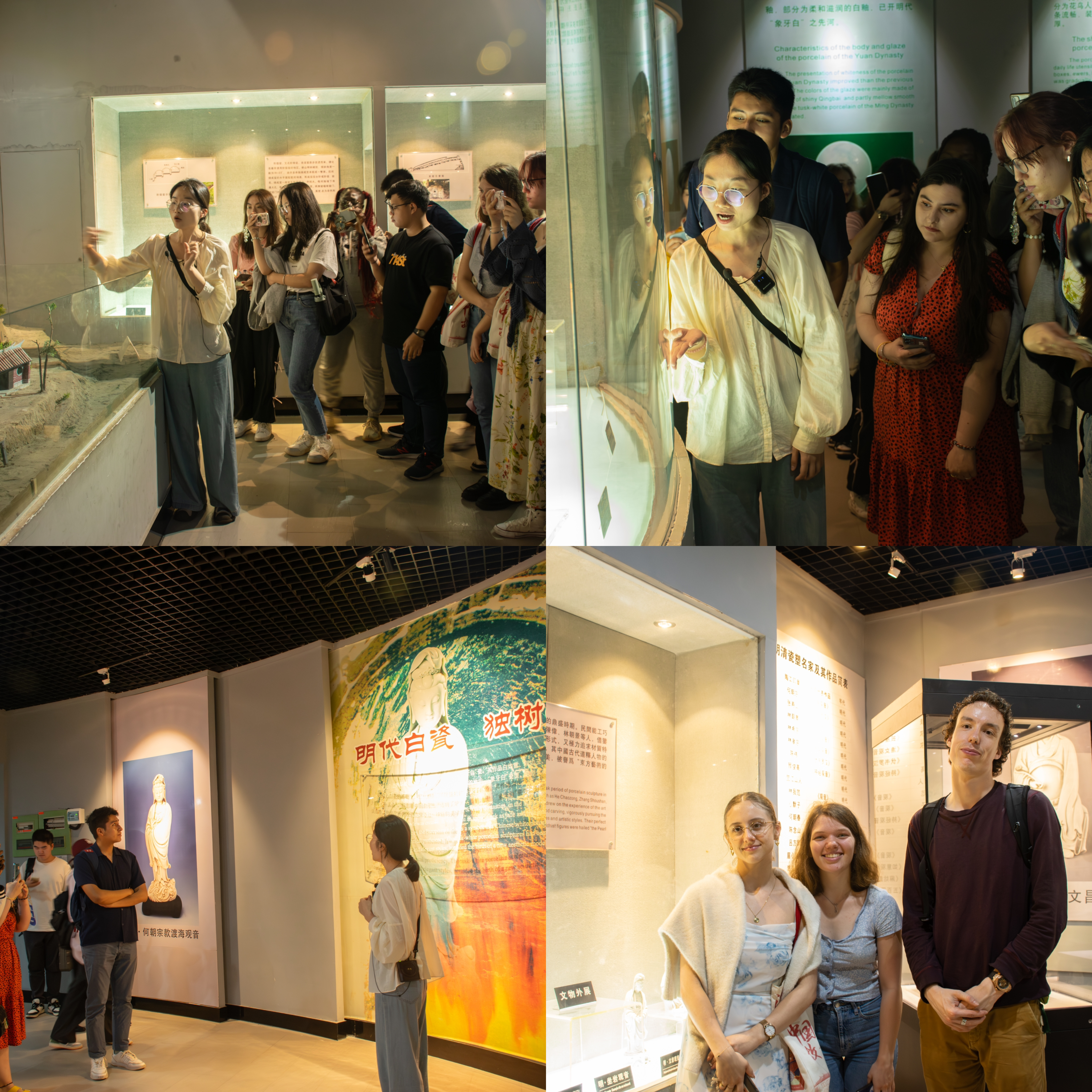 师生一行在讲解员的带领下参观了陶瓷博物馆。上千件纯色夺目,工艺精湛的白瓷藏品,安然栖身于馆,静静等待每一位参访者的探寻与揭秘。固定陈列“德化陶瓷史话”,以时间纵览为脉络线条,勾画了德化瓷器从古至今不同时期的发展面貌和意义非凡的伟大成就,七个展览单元生动展示出德化陶瓷独有的艺术特色、人文内涵,阐明了其在中外交流史上不可忽视的历史地位和纽带作用,也反映了德化瓷器烧制中蕴含的“惟匠心以致远”的工匠精神和“惟创新者进”的创新内核。瓷器不语,却能传达“千言万语”,从一片片岁月流转中重现于世的瓷器碎片,到日臻革新的创作技艺,走过的是千年的春秋与风霜,而德化瓷器依旧“鲜活”。透过参观与讲解,为同学们推开了一扇品味艺术与历史的文化之门。德化瓷器胎体透亮密致、质地纯洁无瑕、釉色晶莹剔透,给大家留下深刻印象。同学们不禁纷纷赞叹中华瓷器的精美技艺,也对瓷器在中西文化交流中的作用有了进一步的认知。