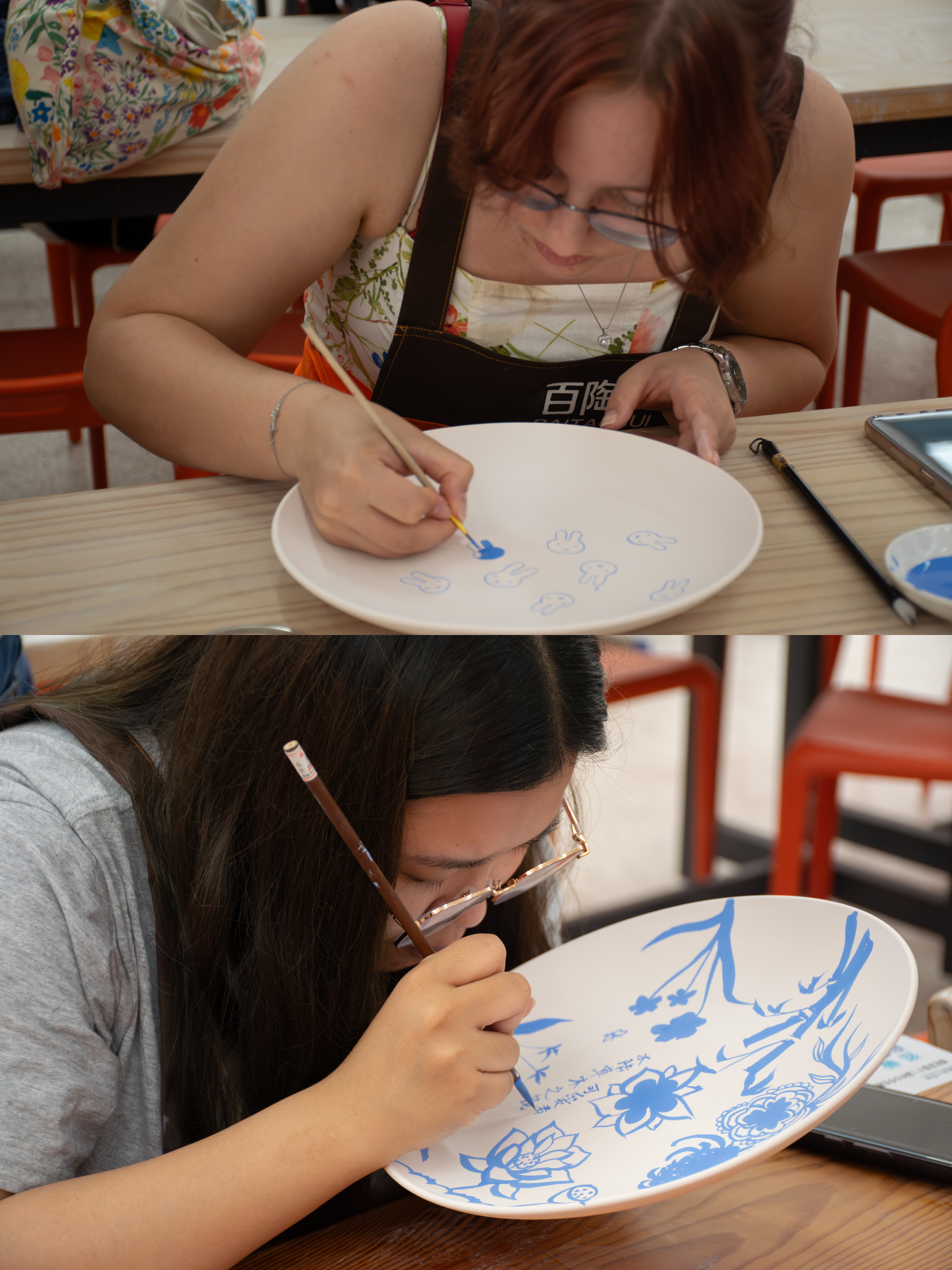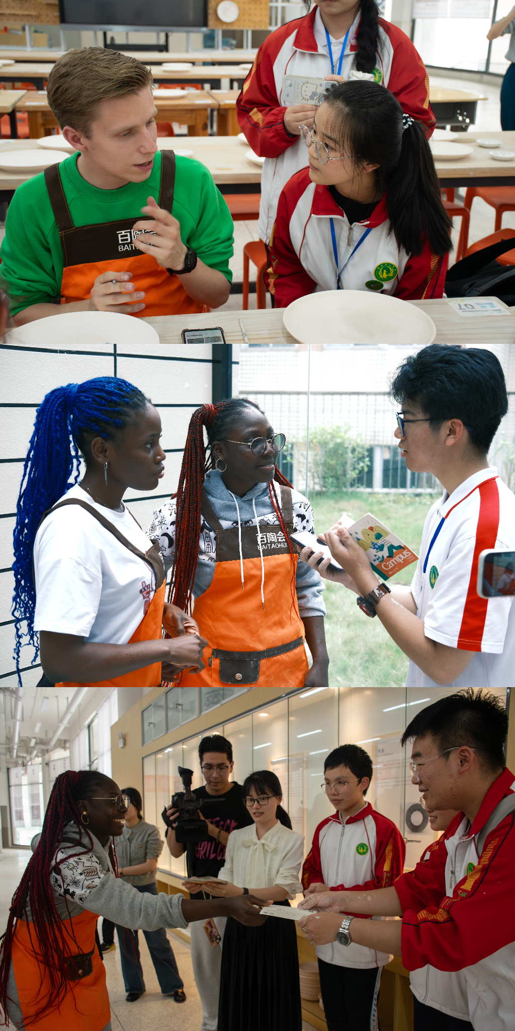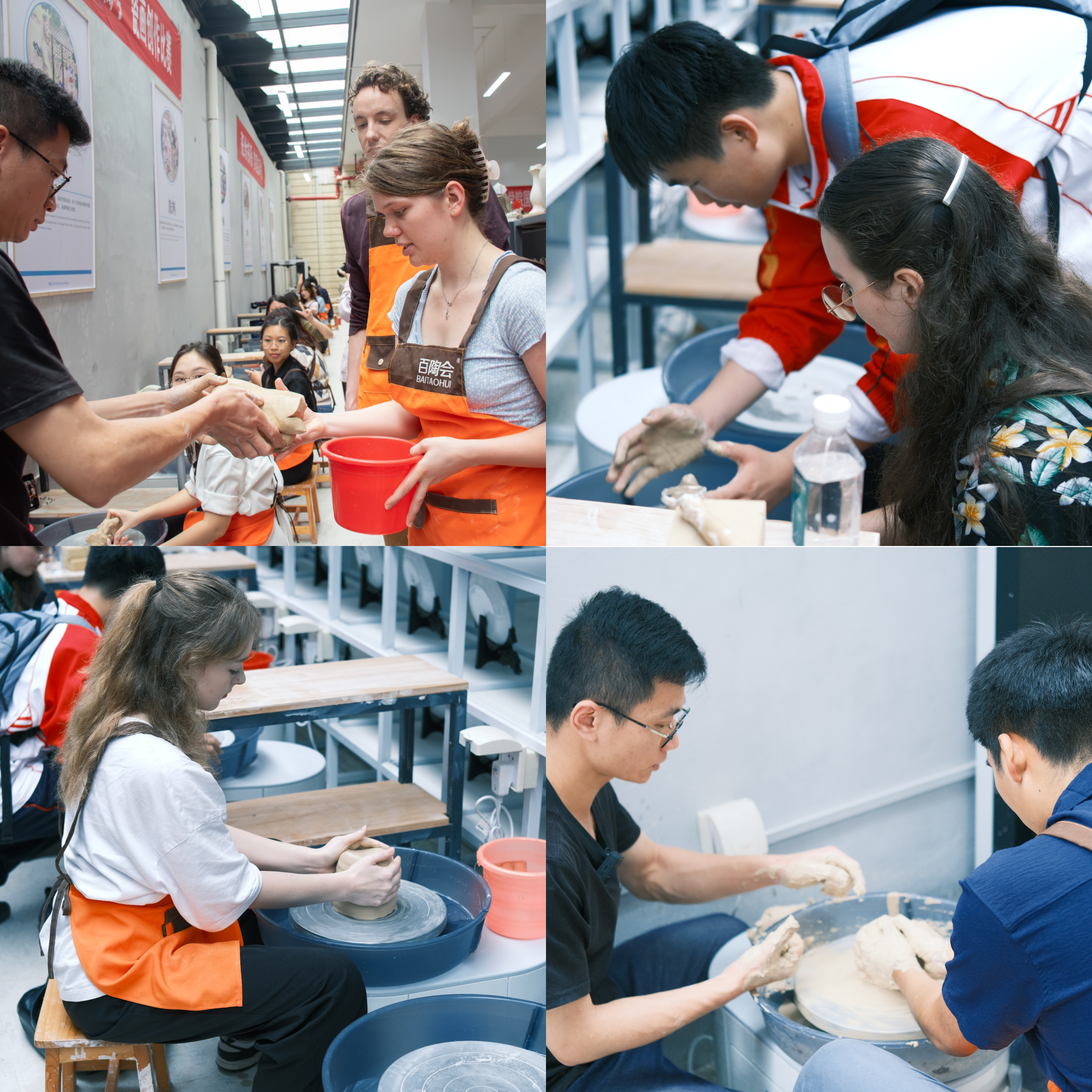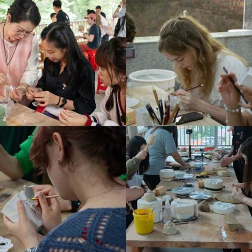 师生到访德化一中与负责人进行交流,并体验手拉胚与瓷板画活动。拉胚又称"走泥",是制作陶瓷的工序之一,也是作品成型的最初阶段。拉胚作为整个工艺的核心内容之一,其好坏程度直接影响上釉烧成的结果。在一中老师和同学的协助指导下,师生将双手置于旋转的泥盘之上,与“泥”亲密邂逅,感受这一自然造物的清凉触感与沁人芬芳。伴随着轻揉慢捻等技法,泥胚不断旋转、升降、延展,勾勒出不同线条与弧度,最终成为被创作者赋予生命、灵性、以及独特形态的瓷器雏形。拉胚过程不仅是触觉上的享受,更是一次艺术与心灵的对话。瓷板画,即瓷上作画。德化瓷板画具有鲜明的民族风格与地域特色,乃是绘画艺术史上的一次重大突破。瓷板画以白瓷之“白”,融水墨与釉彩等不同表现形式与一体,展现出独一无二的美学效果。在瓷盘画创作中,大家充分发挥想象力与创造力,于笔墨青花间,勾勒出心中胸臆,借一双巧手,于方寸之间的瓷盘上流淌出绚烂的色彩 。留学生们接受了一中同学的采访提问,并向他们送上写有祝福与感谢之语的明信片。