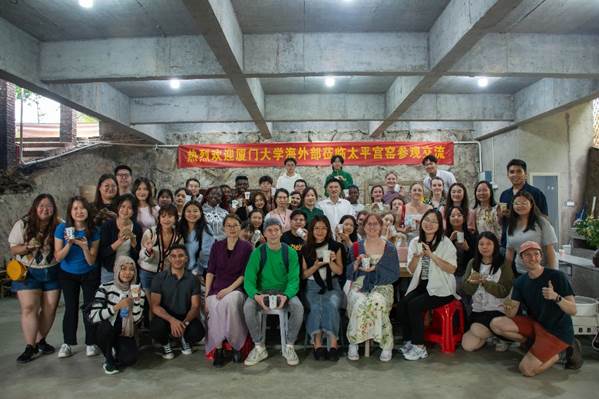 最后一站,大家来到太平宫窑参加点火仪式及体验瓷塑、新彩茶器等活动。太平宫窑位于德化县龙浔镇丁墘村,因历代在太平宫周边筑建龙窑而得名,烧瓷历史已逾千年。泉州市人大代表、丁墘村副主任李文芳表示,柴烧技艺是国家级非物质文化遗产,是中国灿烂烧瓷文明的具象表达。“一窑止,万物兴”,太平宫窑作为千年窑,其复兴正是实现文物活化应用,促进中华优秀传统文化传承发展的重要举措。师生现场观看了盛大的龙窑点火启动仪式。原泉州市委政法委书记何锦龙、林玉萍副县长、林明华副书记等领导与在场嘉宾、同学共同为龙窑点火添柴。当柴火投入窑内,泥与火交汇共舞,借火成器,于火焰中重生的正是德化传承千年的“瓷都之魂”。窑火不“熄”,碓声不绝,文脉不止。德化瓷塑是中国陶瓷发展史上不可忽视的精品之作。瓷艺师以捏、塑、雕、刻、刮、接、贴等技法创作出栩栩如生的瓷塑作品。通过现场体验,师生更觉德化瓷塑技法的精巧,以及瓷塑作品制作之不易。在茶器添彩中,师生执笔泼墨,于白色茶器之上描绘心中所想,成就万千新彩图文,与纸张作画迥异的体验让留学生们了解到中国画作与瓷器艺术融合之精妙。