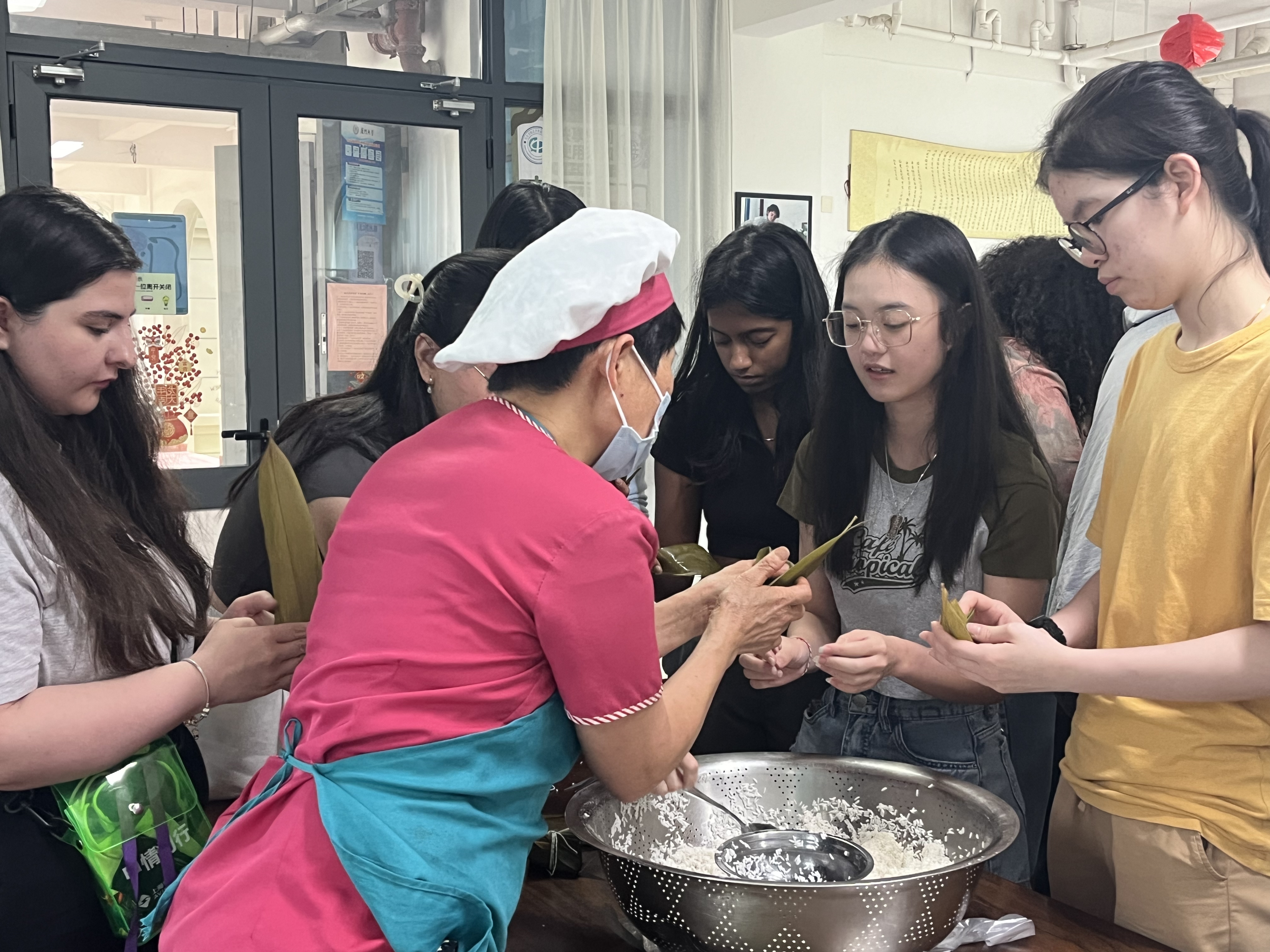 粽叶清香,糯米软黏。在食堂工作人员的指导下,中外学生们一同动手,手握粽叶,反复对折,再舀入糯米、红豆等馅料,将其压实,形成三角形状,并用绳子缠绕。双手在翠绿粽叶间穿行、折叠、盛米、压实、包紧和扎绳,一个个“五花大绑”的粽子就诞生了。现场氛围热烈,传出阵阵浓情。大家从完全不会到逐渐娴熟,在感受实践乐趣的同时也沉浸在节日文化之中。