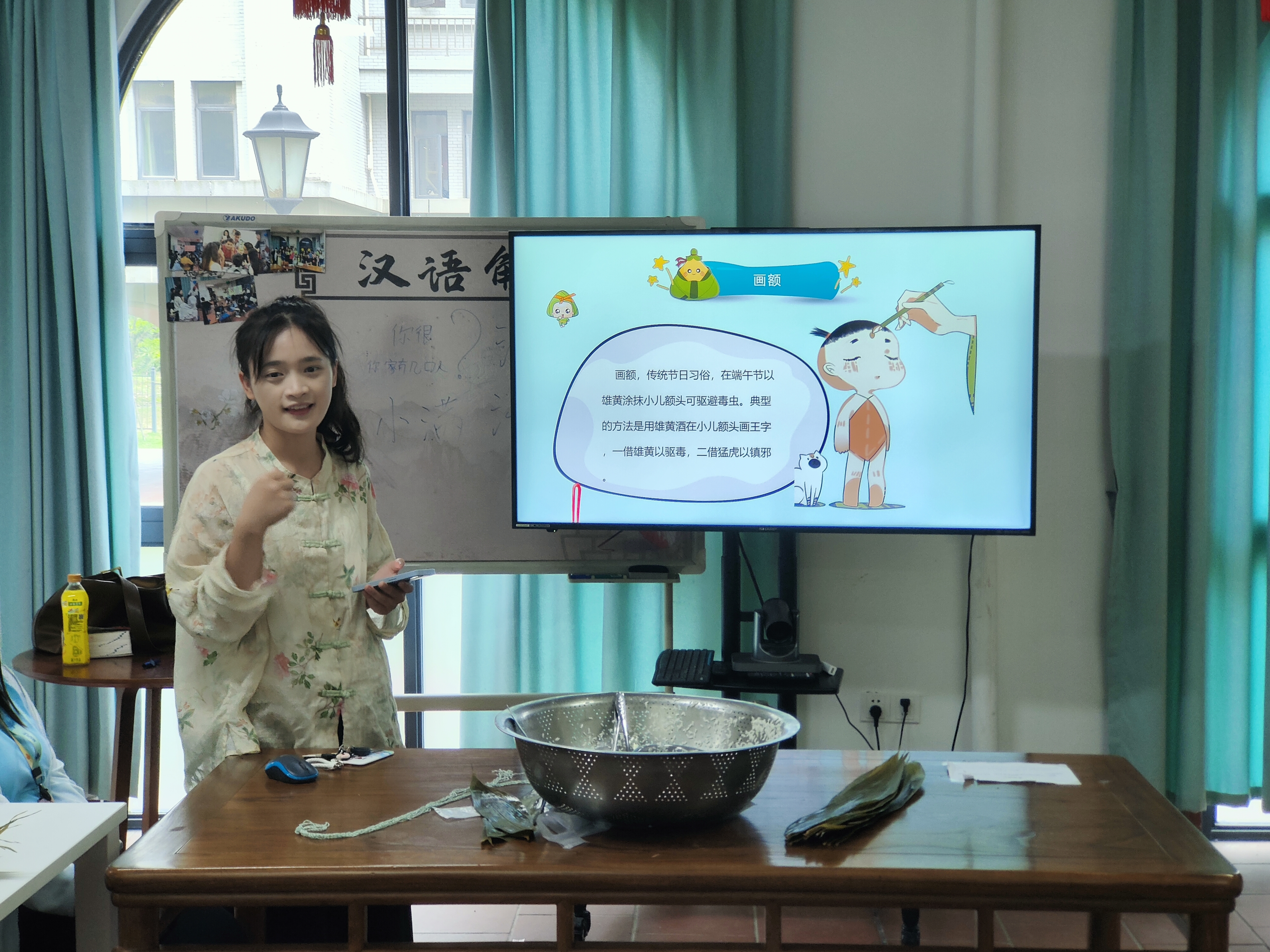 研究生杨泽義为大家讲解了端午节的由来,以及划龙舟、吃粽子、戴香包、挂艾草等端午习俗,并向大家介绍了中国南北方不同口味的粽子,帮助同学们深入了解端午文化。