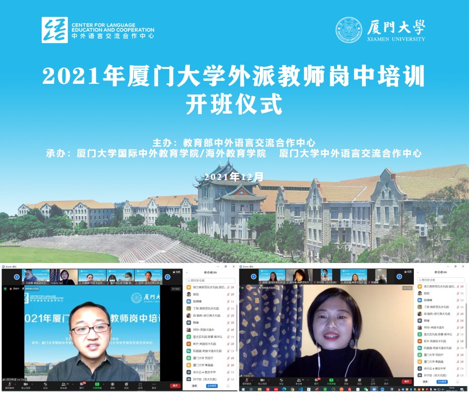 12月11日,2021年厦门大学外派教师岗中培训顺利开班。本次培训采取线上形式,由教育部中外语言交流合作中心主办,厦门大学国际中文教育学院/海外教育学院、厦门大学中外语言交流合作中心承办,是厦门大学举办的首届外派教师岗中培训。来自厦门大学及华侨大学18所孔子学院/孔子课堂共37名在岗外派教师齐聚云端,厦大国际中文教育学院/海外教育学院党委书记范丽、授课专家韩臻、吕伯宁及相关行政人员参与开班仪式,开班仪式由厦大语合中心副主任林琳主持。