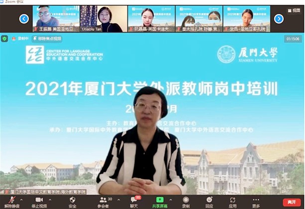 范丽首先感谢各位在岗教师的辛勤付出。她说,习近平总书记致厦大100周年贺信中,充分肯定了厦门大学在“中华文化海外传播做出了积极贡献”,这其中也包含了各位在岗教师的一份功劳。她勉励在岗外派教师为“推进国际传播能力建设,讲好中国故事,展现真实、立体、全面的中国”做出自己应有贡献。并指出,随着我国综合国力的不断提升,在国际舞台上,我们已迎来了国际中文教育的新时代。在后疫情时代,教育信息化、智能时代转型为国际中文教育带来了巨大机遇与挑战,构建一支高素质的教师队伍是国际中文教育学科和事业发展的必要条件。此次培训目的就在于支持外派在岗教师专业发展,提高教师疫情下的工作胜任力,加强国际中文教育和服务,推动国际中文教育提质增效。同时,她提醒大家在疫情反复的情况下,要做好自我防护,确保健康、安全。
