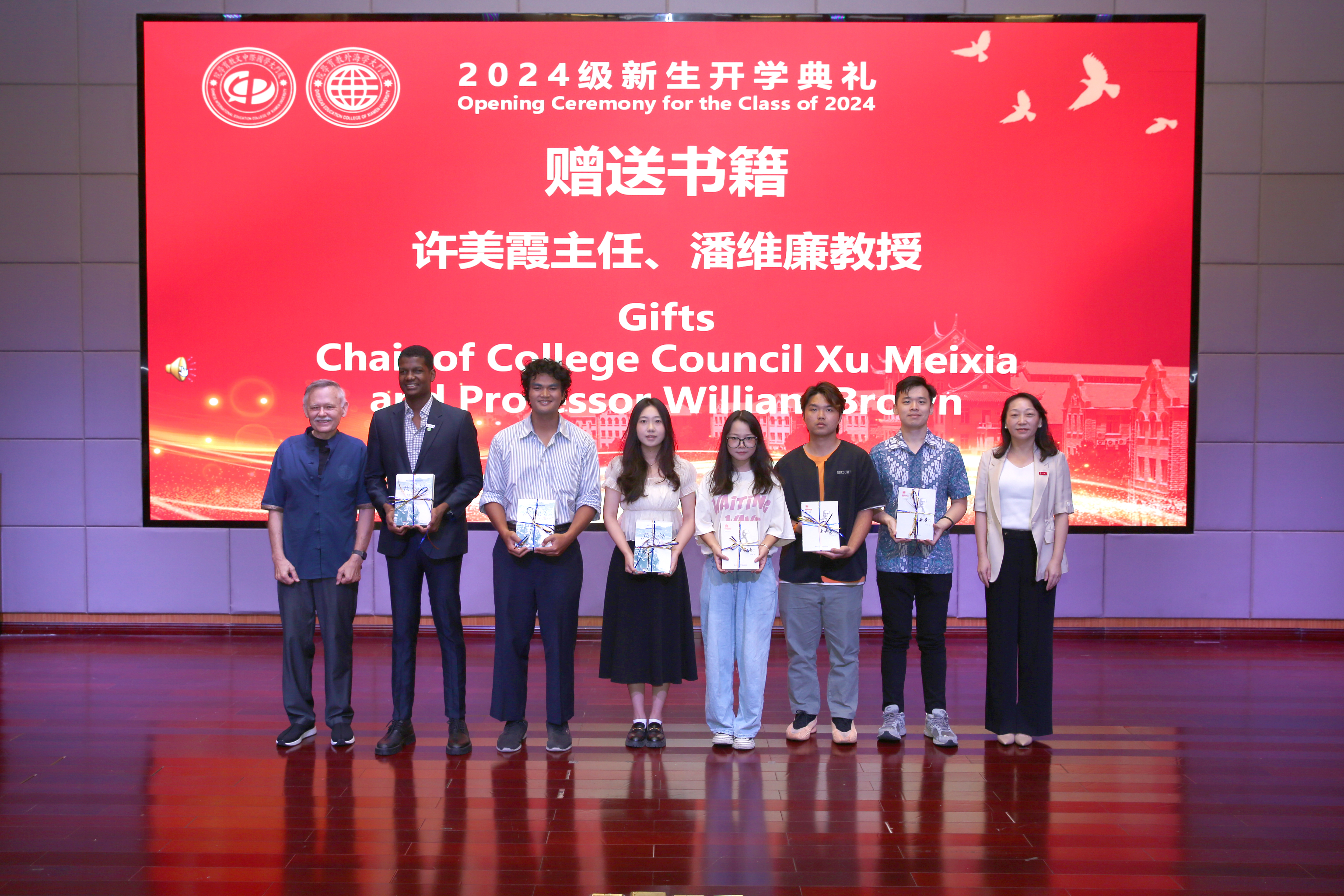 许美霞和潘维廉为新生代表赠送书籍《陈嘉庚传》和《我不见外——老潘的中国来信》。书籍的传递,彰显学院对厦大学子不断学习和传承嘉庚精神的期许,也激励着新生好好学习,讲好中国故事,向世界展现真实、立体、全面的中国。