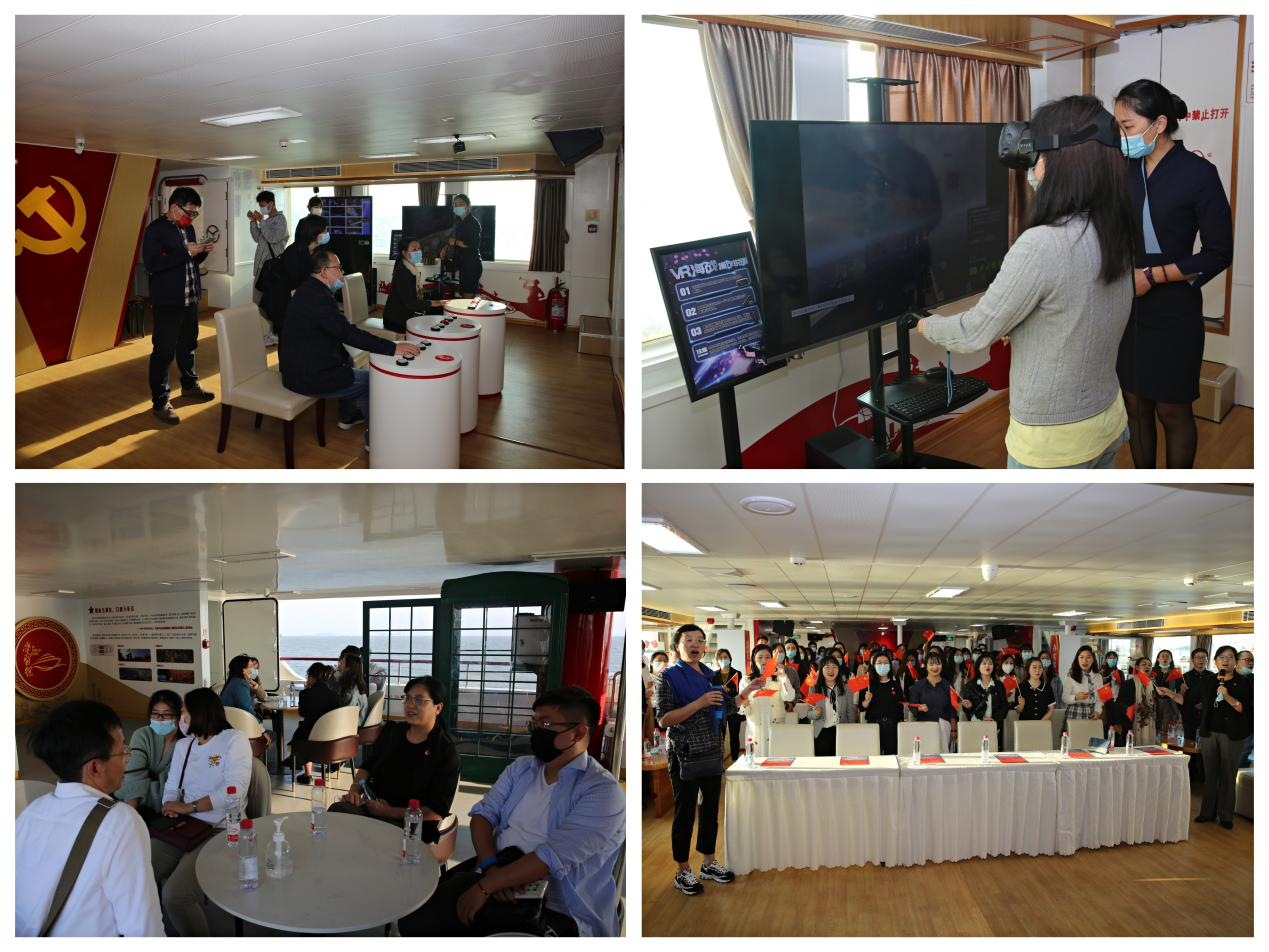 接着,师生党员在船上展开了自主探究活动。在多功能学习区,部分党员开启了激烈的党史答题竞赛,部分党员则借助VR设备穿越历史,感受过往峥嵘岁月;也有党员一边眺望着厦门现代化都市的天际线,一边追忆党的光辉历史。大家在古今对比、海陆结合的特色探究活动中深刻领会着党和厦门人民的伟大奋斗精神和爱国主义情怀。