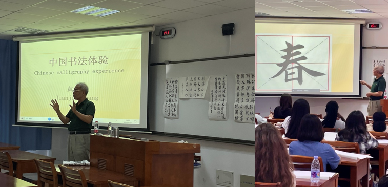 为了让来华留学生深入了解和体验中国文化,激发汉语学习兴趣,丰富课余生活,近日,国际中文教育学院/海外教育学院推出“传统文化系列讲座”,将第一课堂的语言学习与第二课堂的文化实践结合起来,更好地助力汉语学习。9月23日下午,学院开展了系列讲座第一讲——中国书法体验讲座,学院原副院长黄建军副教授主讲。
